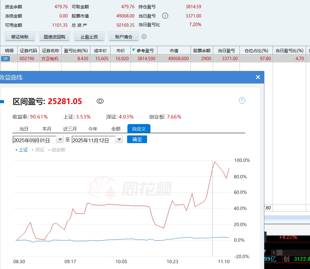 四年万倍,4万到1亿,亿万富翁实盘第11天收盘持仓,继续满仓格局002196,盘中做了一下高抛低吸,成本降低一点点。605178开盘拉涨停,我就知道昨天被洗出来了,没有办法,连作手新一这样的大佬都被洗出来,只能说主力操盘太狠了,这再次说明认知到位,做不到一样无法赚钱,知道不等于做到,只有知行合一才能赚钱。所有的账户同步操作,一个账户翻倍,所有的账户跟着翻倍,没有区别。需要帮忙做联系。