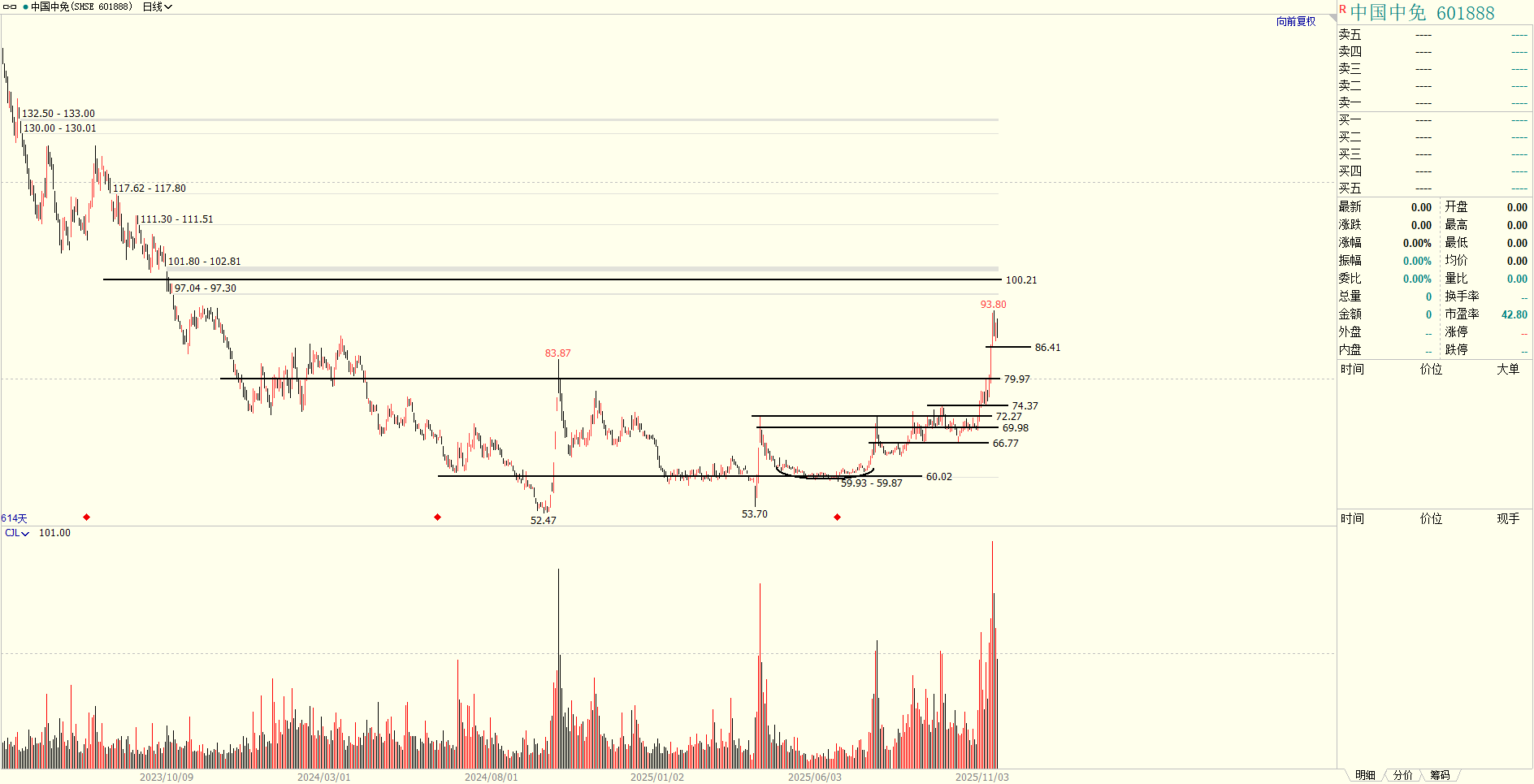 一把直尺打天下/中国中免60-80之间大规模底部箱体,趋势目标160;当前上涨到