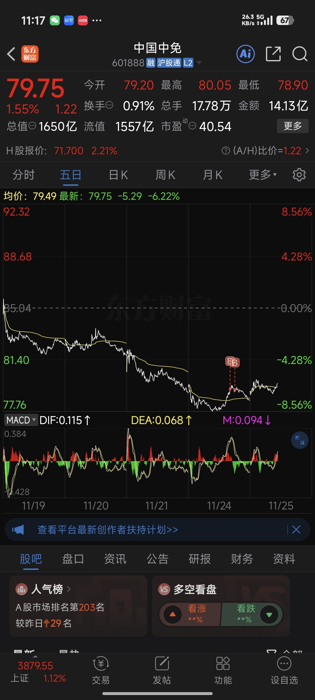 $中国中免(SH601888)$ 今天必须拉个中阳线,不然都是弱势呀
