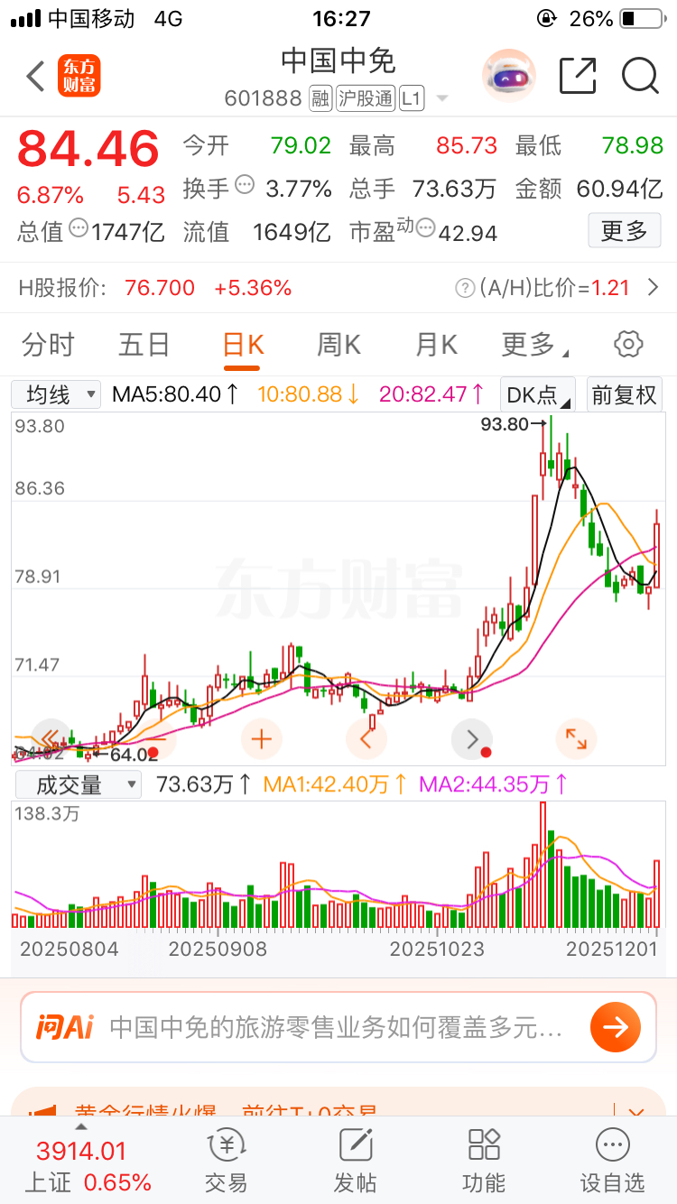 $中国中免(SH601888)$ 早盘把所有的股票全部淸仓,集中所有资金全部买入中国中免,快过年了,博一把这个大消费。