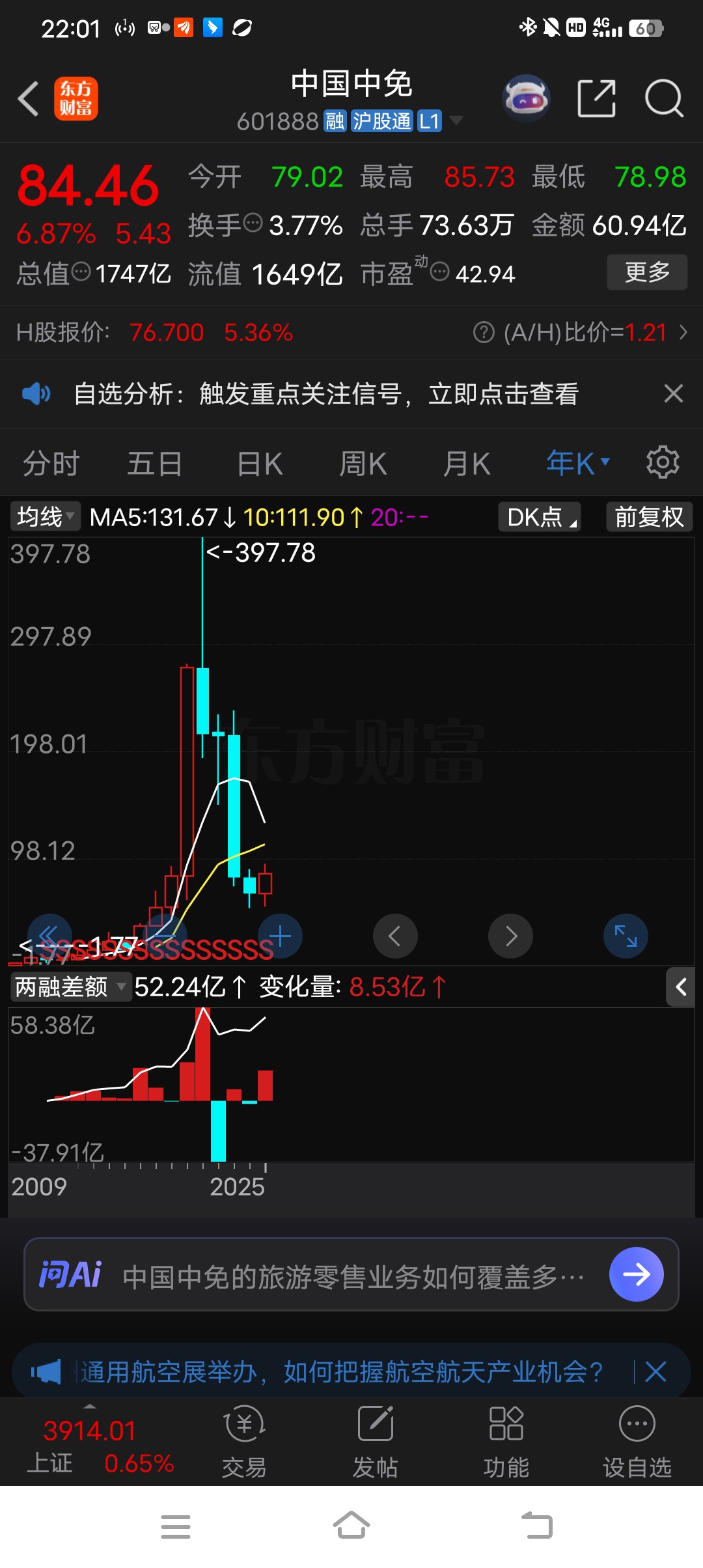 中免调整了4年,最高397.78元,目前来说价钱很价加上政策利好,这波破100分