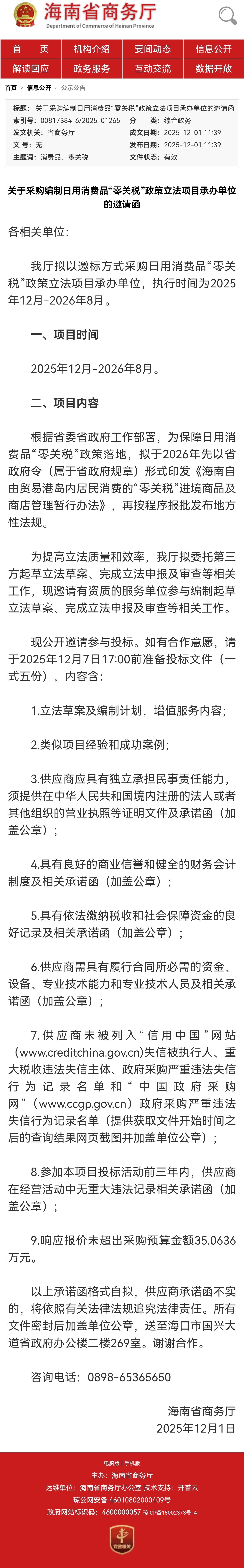 关于采购编制日用消费品“零关税”政策立法项目承办单位的邀请函