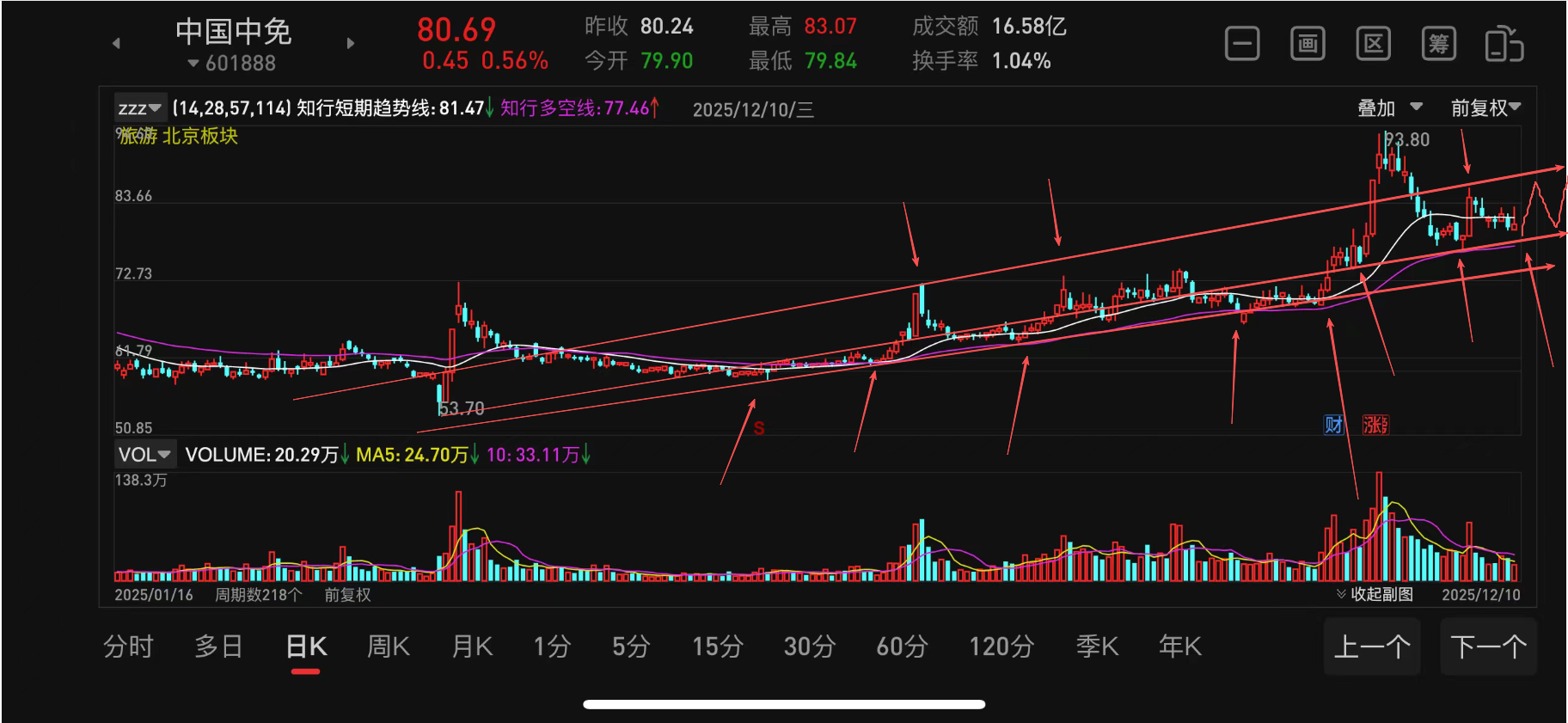 $中国中免(SH601888)$ 中免的k线图,上升通道中 长线持有必将胜利