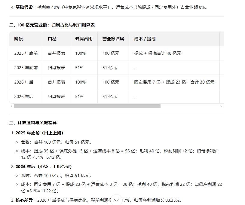 以100亿营业额为计算基础,不管是上海机场中标还是北京机场中标相对于2026年之前的合约,新合同为 “月固定费用 + 8%-24% 提成”(虹桥 8%-22%),年固定费用约 7 亿元,综合成本率降至 30%-35%。2026 年后提成与保底优化,税前利润提升 9.17%,归母净利润增长 83.33%。都是有利中国中免的。