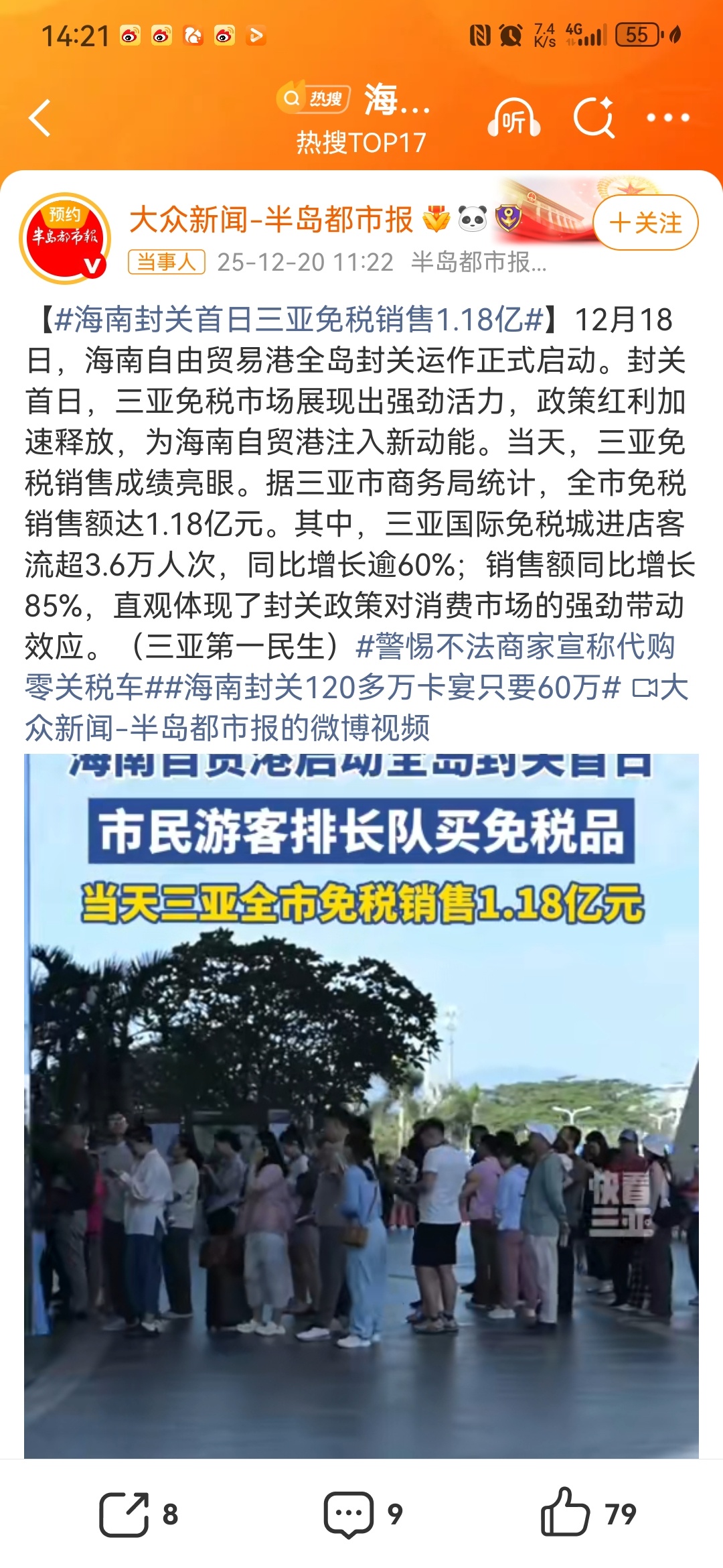 $中国中免(SH601888)$ 【#海南封关首日三亚免税销售1.18亿#】12月18日,海南自由贸易港全岛封关运作正式启动。封关首日,三亚免税市场展现出强劲活力,政策红利加速释放,为海南自贸港注入新动能。当天,三亚免税销售成绩亮眼。据三亚市商务局统计,全市免税销售额达1.18亿元。其中,三亚国际免税城进店客流超3.6万人次,同比增长逾60%;销售额同比增长85%