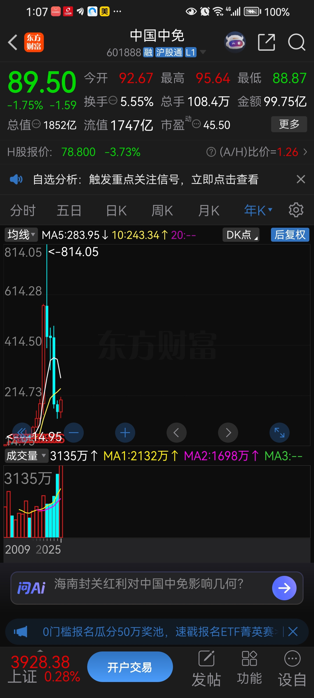 $中国中免(SH601888)$ 中国中免年线仍处在低位!五年内能创新高吗?