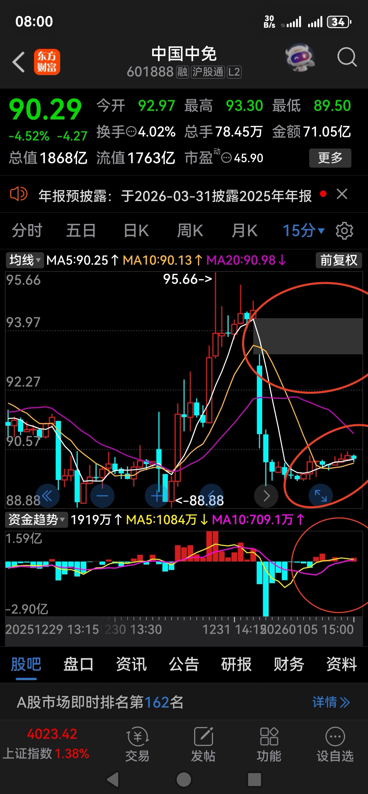 $中国中免(SH601888)$ 15分钟K线已经走平并向上,上方94.55缺口85%三天内回补。