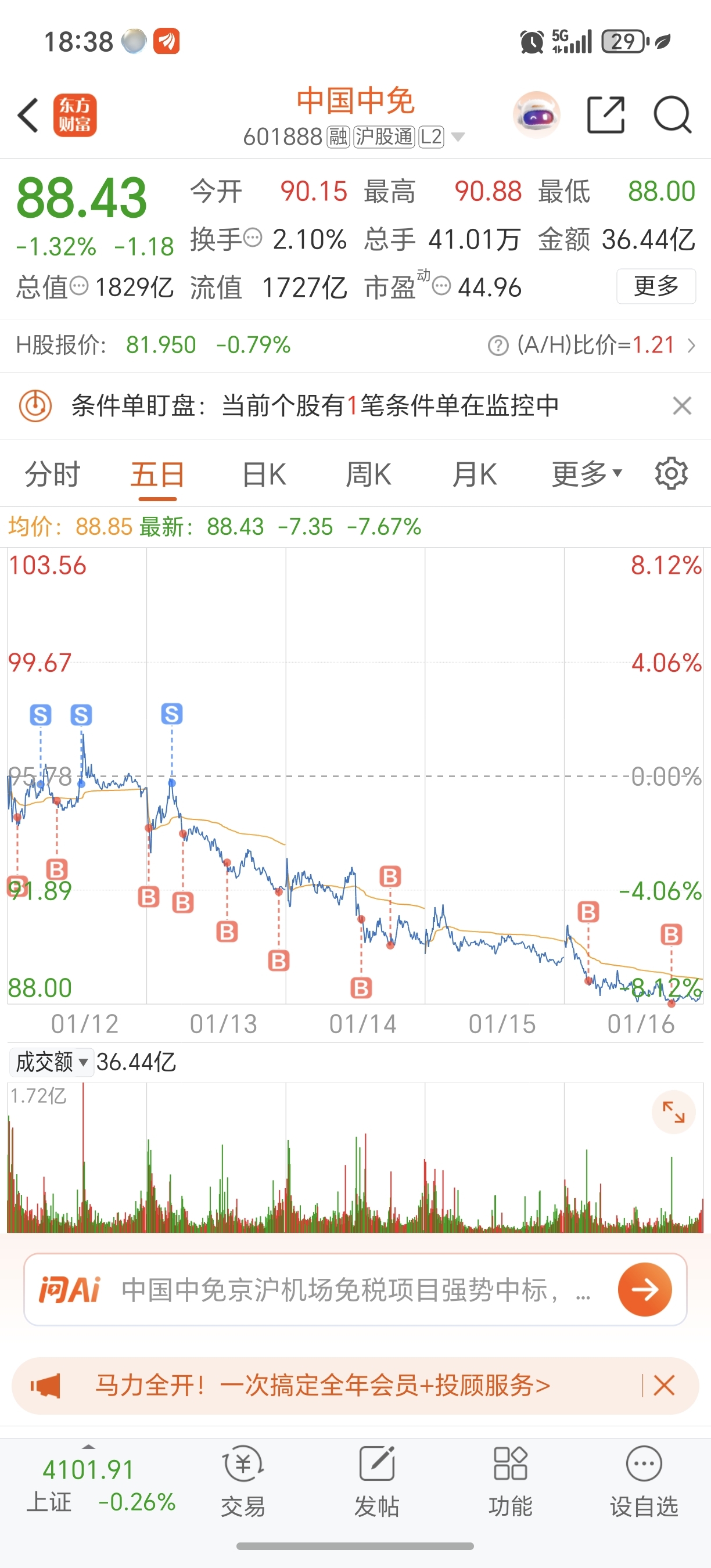 $中国中免(SH601888)$ 终于下跌了。哈哈这次希望能跌到60