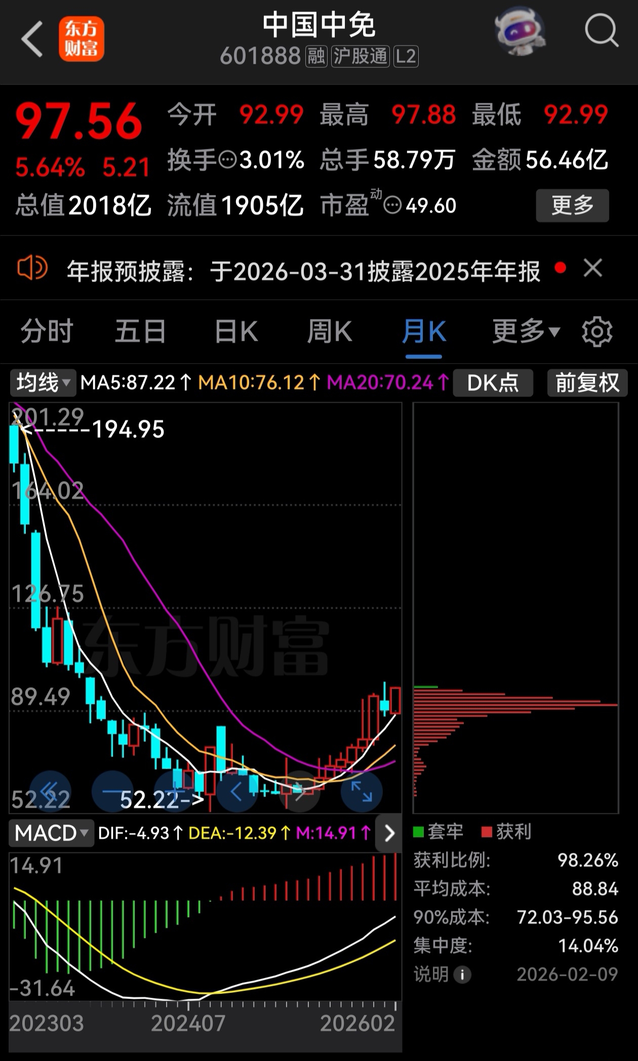 $中国中免(SH601888)$ 看月线,98上方已经没有套牢盘,98上方全割肉了,现在还是反弹,过135(60月线)趋势彻底扭转。