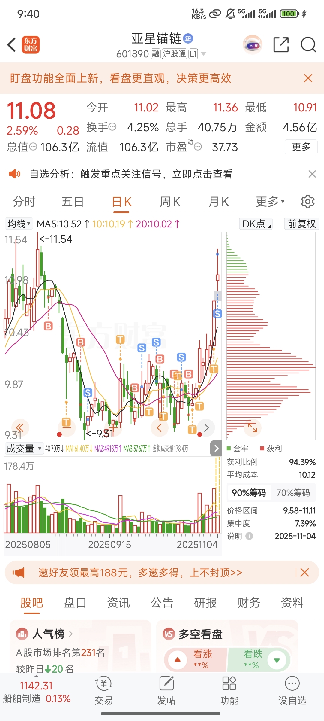 $亚星锚链(SH601890)$ 从10.88的1/3仓到全仓做T,期间有懊悔有喜悦,到现在21%走了,感谢亚星锚链