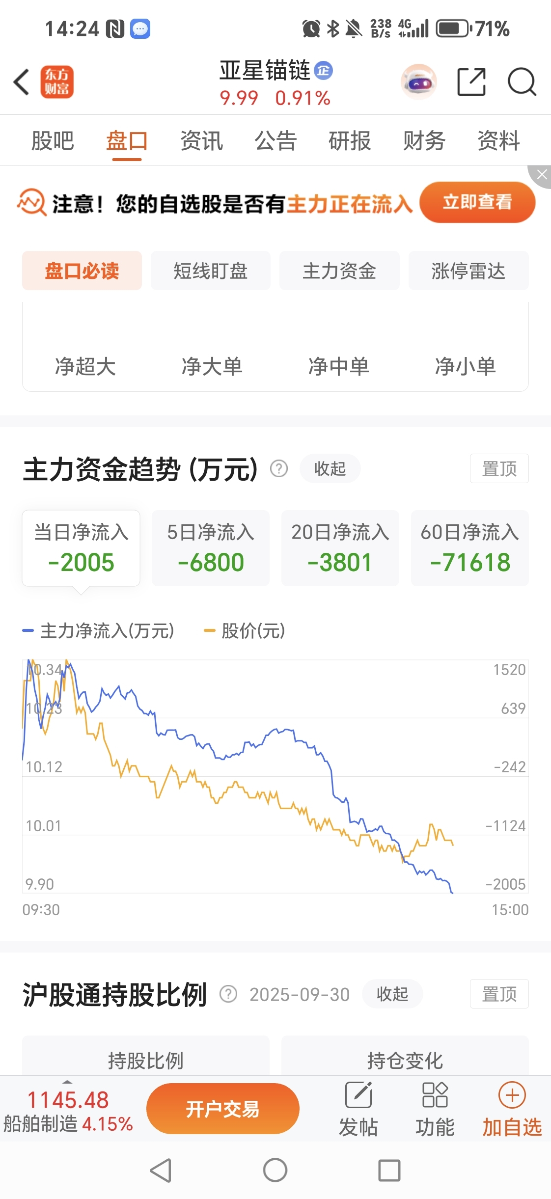 $亚星锚链(SH601890)$ 开盘主力净进去1.5个亿到现在负流入,主力一直在出货,今天的上涨纯粹是消息刺激,收盘不绿已经是不错了,今天套进去不少人,明天开盘估计水下开了