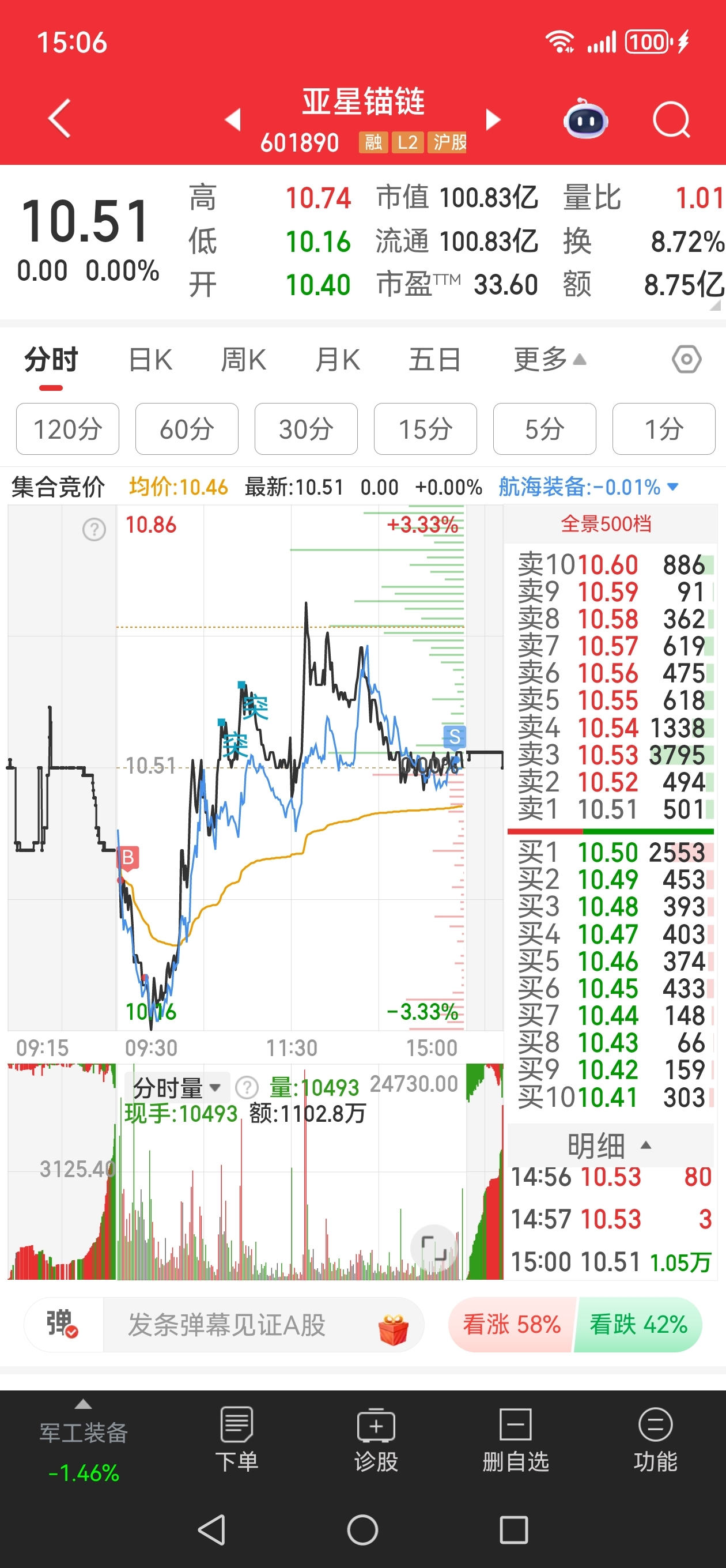 $亚星锚链(SH601890)$ 老庄,我每天200手陪你做t,今天早盘均价10.328买入,尾盘10.52卖出