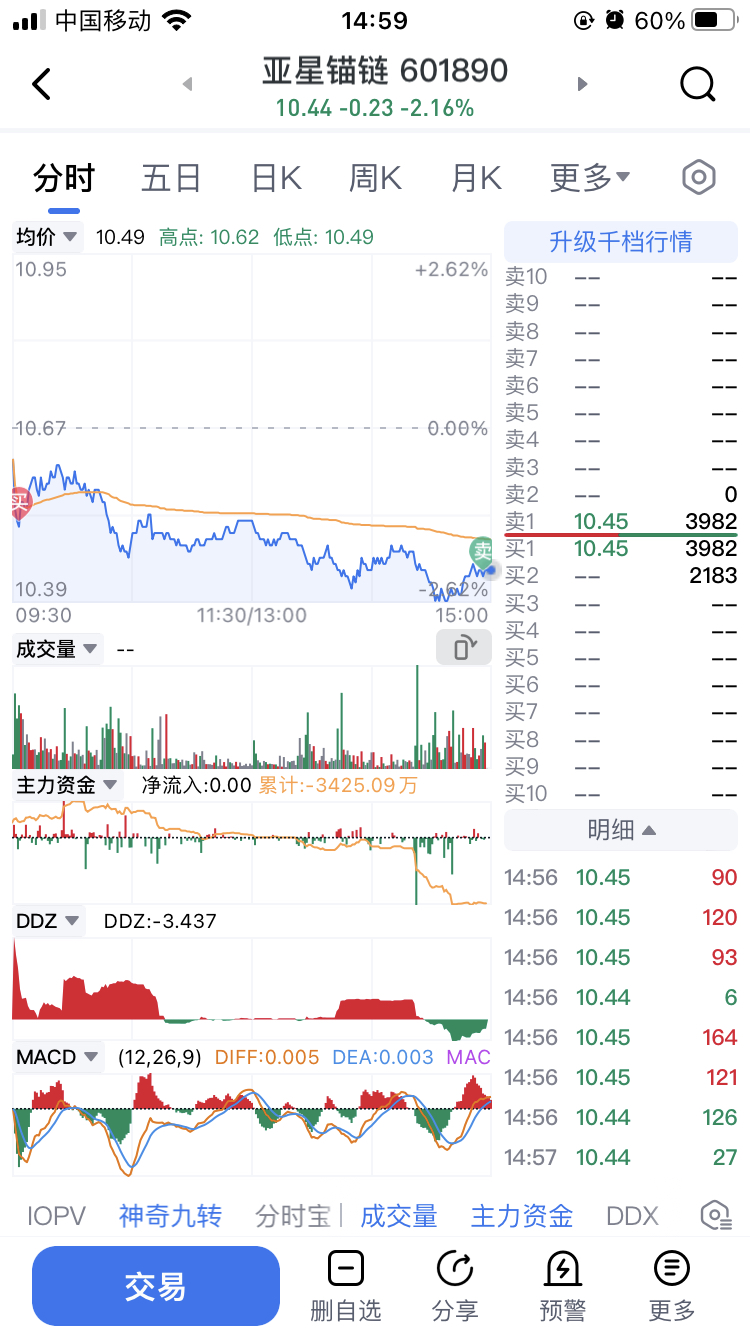 $亚星锚链(SH601890)$ 昨天高位减仓,今天即使倒T几分依然减仓,明天冲高再减仓,你若再绿我再加仓