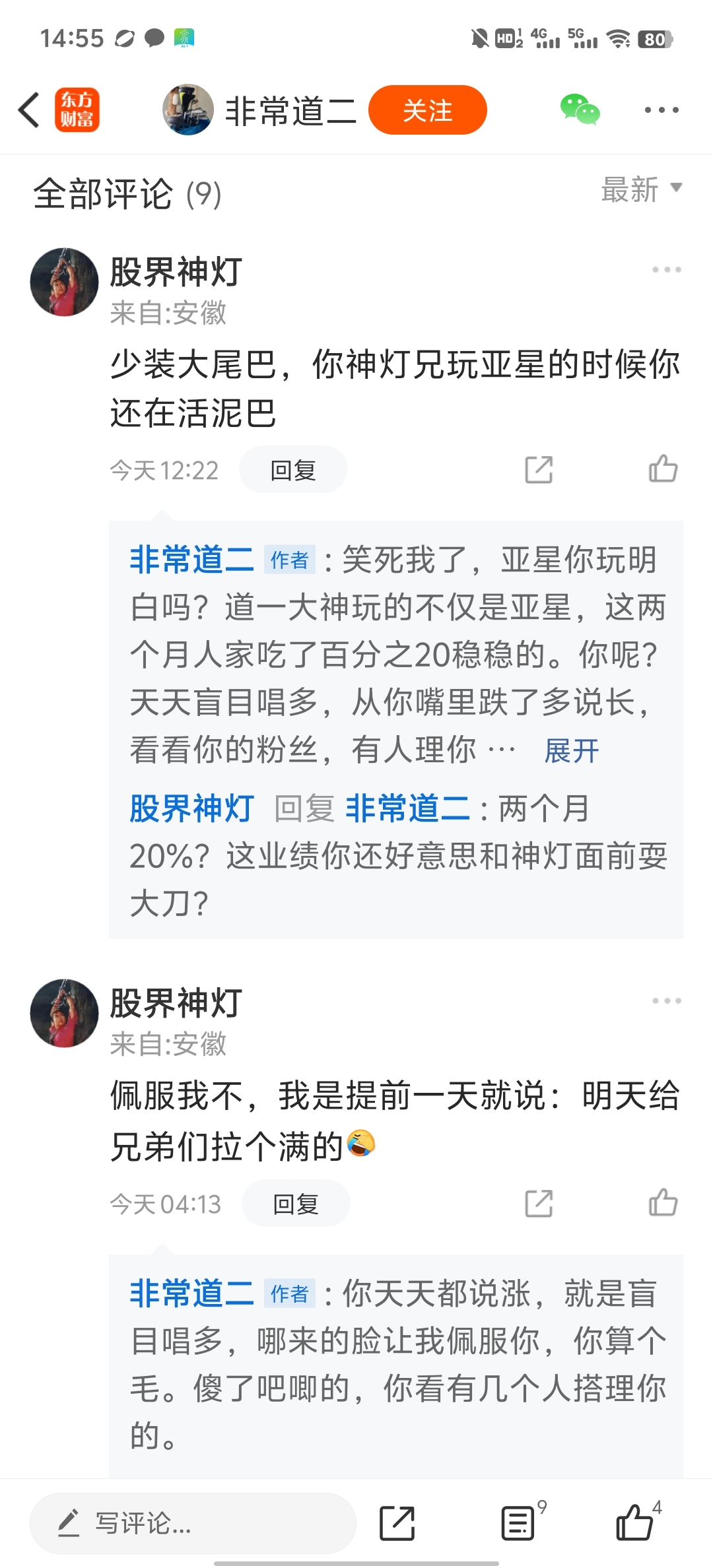 $亚星锚链(SH601890)$ 道二,神灯本与你往日无冤近日无仇,但鉴于你态度如此嚣张,神灯必须为贴友们站队,以正视听。这次回复你,也是唯一一次回应你,且神灯一贯作风是点到为止,不做无畏的争吵。你说你2026年以来吃了20%,我承认你还可以,但要始终保持初心,切勿焦躁。