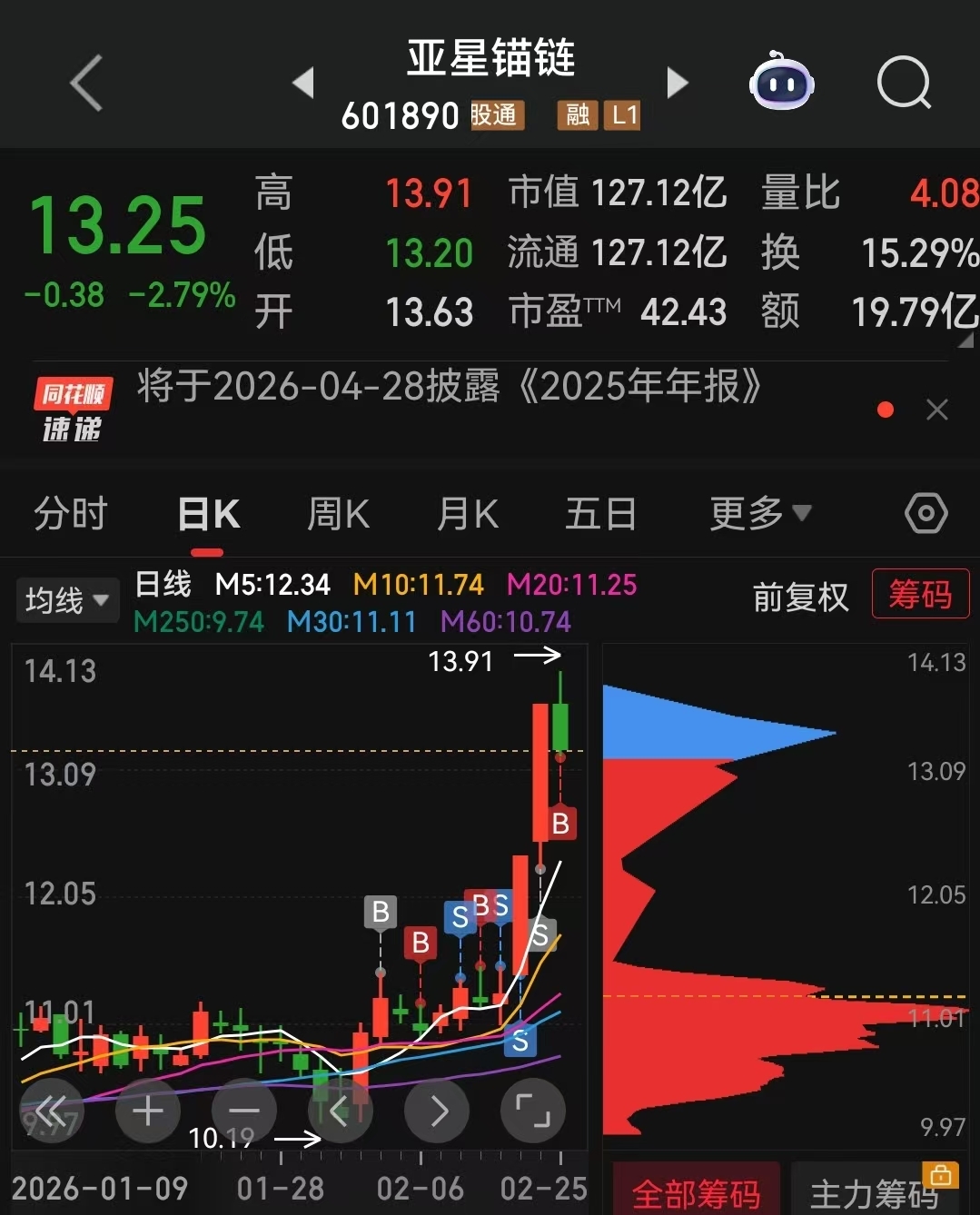 $亚星锚链(SH601890)$ 昨天炸板跑完了,今天早上13.4买入,收盘强行拉回我的买入价,明天要是下去继续加,我就不信庄家就这点野心!