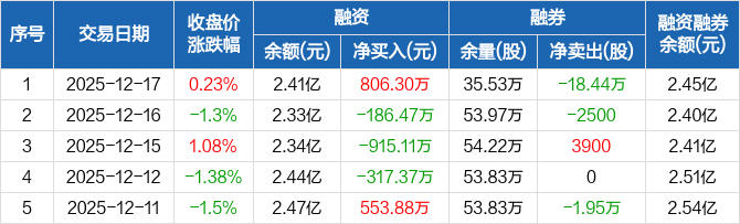 融资方面,当日融资买入1792.34万元,融资偿还986.04万元,融资净买入806.3万元。融券方面,融券卖出4100股,融券偿还18.85万股,融券余量35.53万股,融券余额458.63万元。融资融券余额合计2.45亿元。