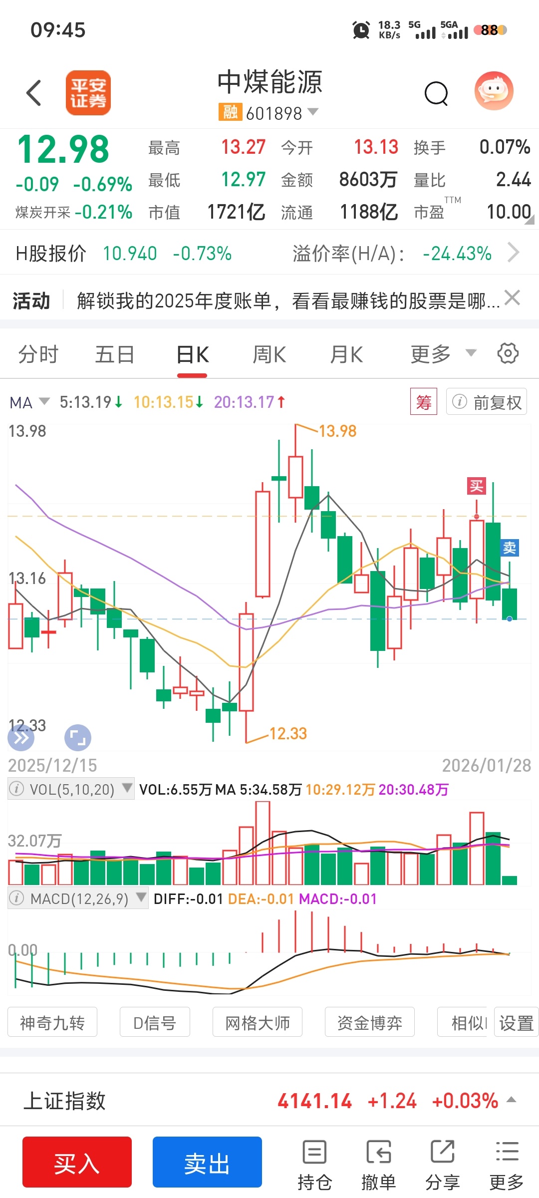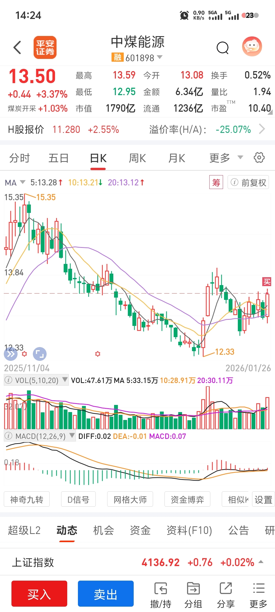 $中煤能源(SH601898)$ 今天是个杀猪盘行情,机会不多,找来找去都不尽如人意,就选了这个票,这大的盘子,我实在是不愿意进,当年刚入股市时没少在大盘股里面挨宰,现在有点膈应大盘股,不过今天还就看到那么几个机会,这个票的分时走势最健康,再吃一把回头草