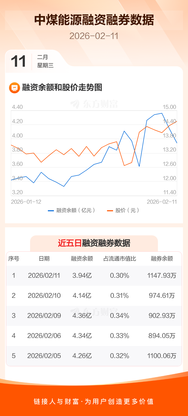 交易所最新数据显示,中煤能源于2026年2月11日获融资买入5286.40万元,融资偿还7281.66万元,当日融资净偿还1995.27万元。目前,该股融资余额3.94亿,占流通市值比例为0.30%。