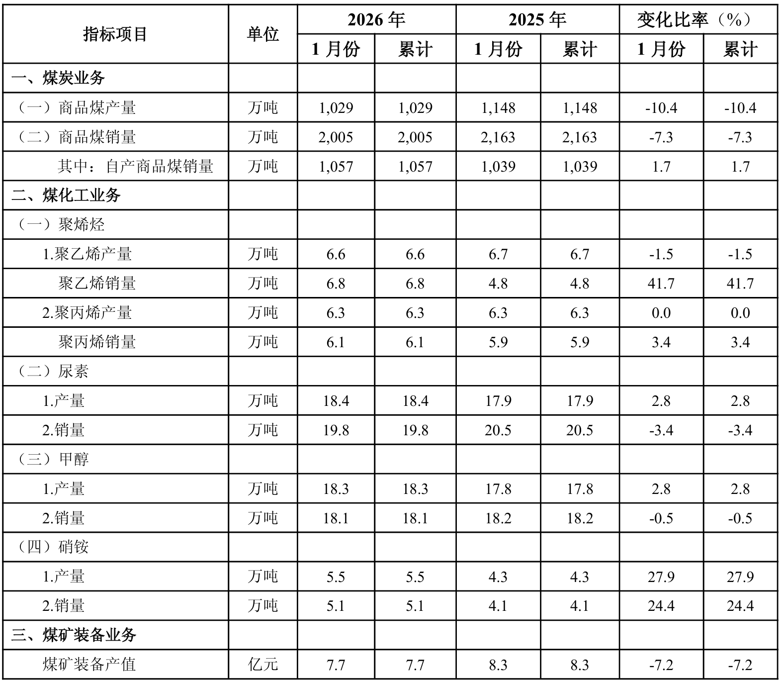 2月12日,中煤能源(601898/01898)发布公告,2026年1月,公司商品煤产量达1029万吨,同比下降10.4%;商品煤销量2005万吨,同比下降7.3%,具体数据如下: