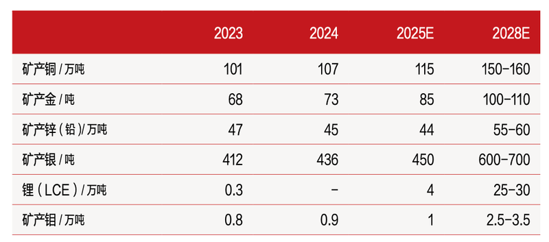 紫金矿业2023年、2024年产量及未来产量计划。来源/公司年报