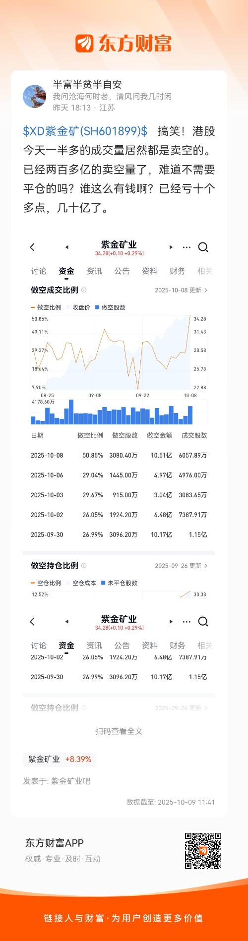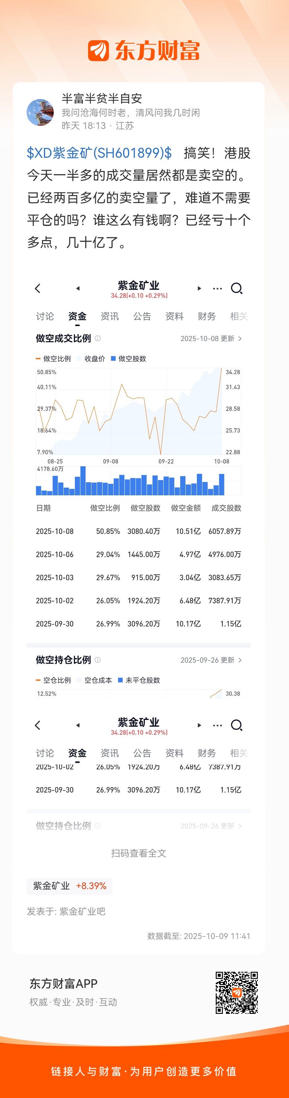 $XD紫金矿(SH601899)$ 搞笑!港股今天一半多的成交量居然都是卖空的。已经两百多亿的卖空量了,难道不需要平仓的吗?谁这么有钱啊?已经亏十个多点,几十亿了。