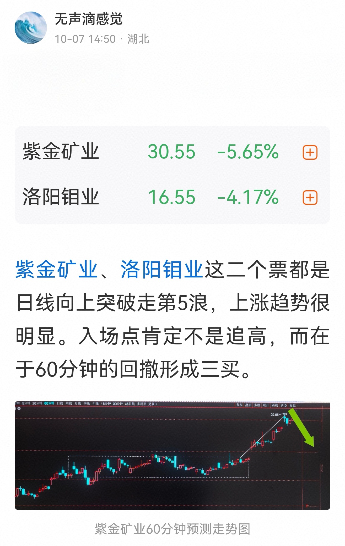 :紫金矿业、洛阳钼业这二个票都是日线向上突破走第5浪,上涨趋势很明显。入场点肯定不是追高,而在于60分钟的回撤形成三买。$紫金矿业(SH601899)$$洛阳钼业(SH603993)$$赤峰黄金(SH600988)$