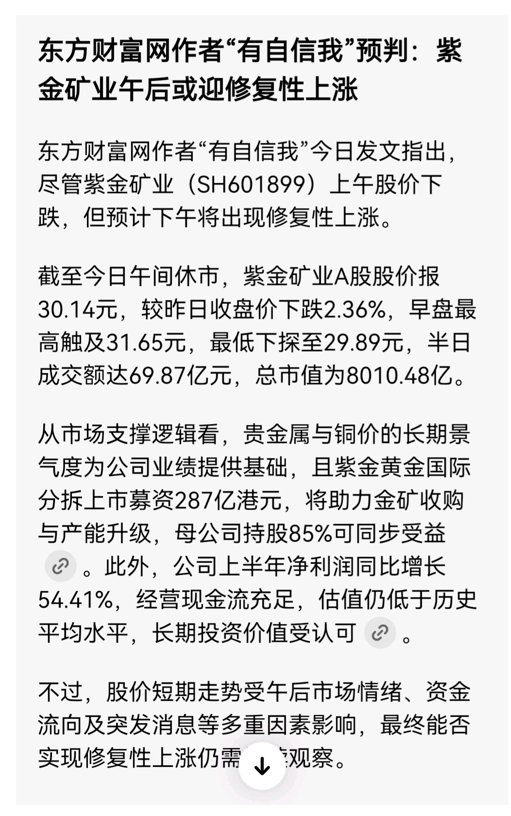 东方财富网“有自信我”预判:紫金矿业今日下午或迎修复性上涨