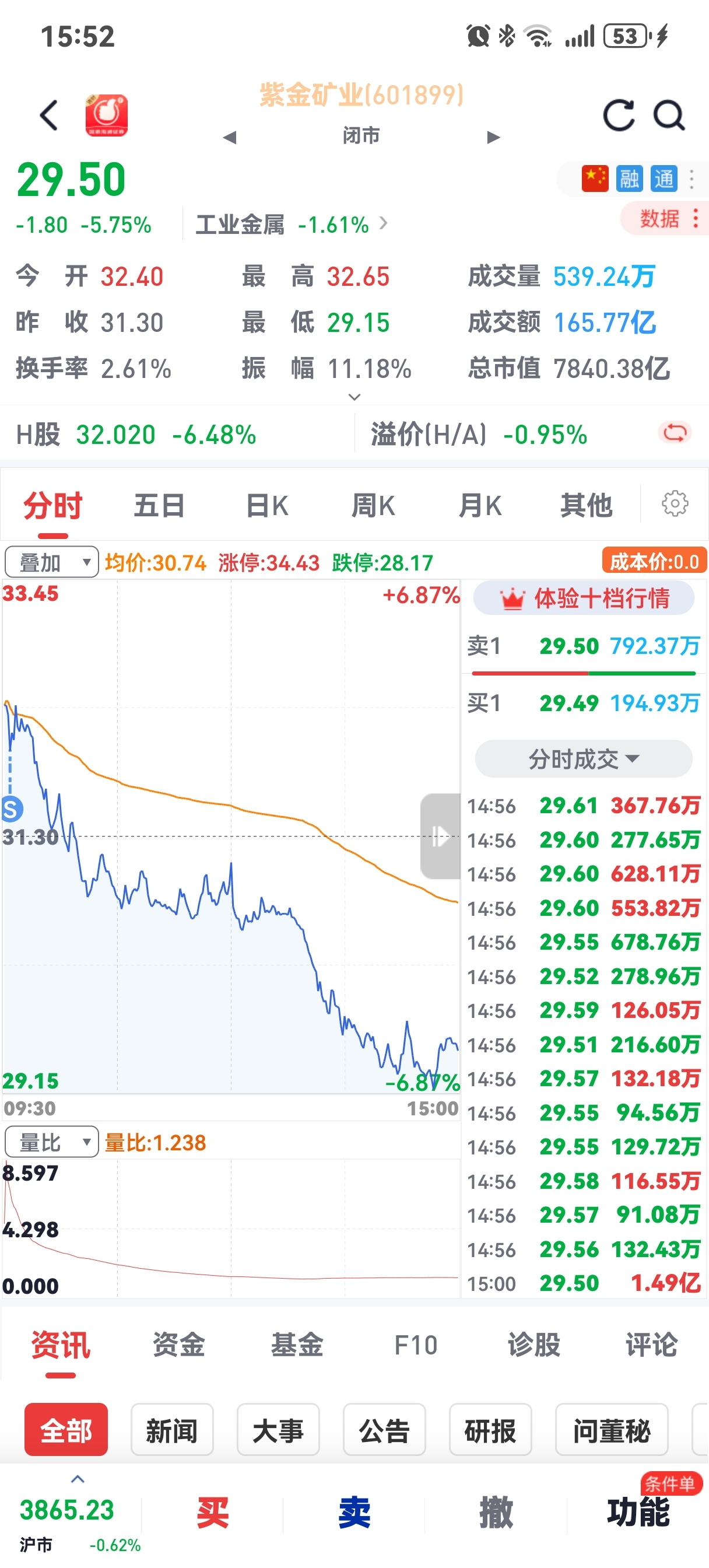 $紫金矿业(SH601899)$ 还是贪心了,开盘看到32.5没出,下来了才走,少赚了几千
