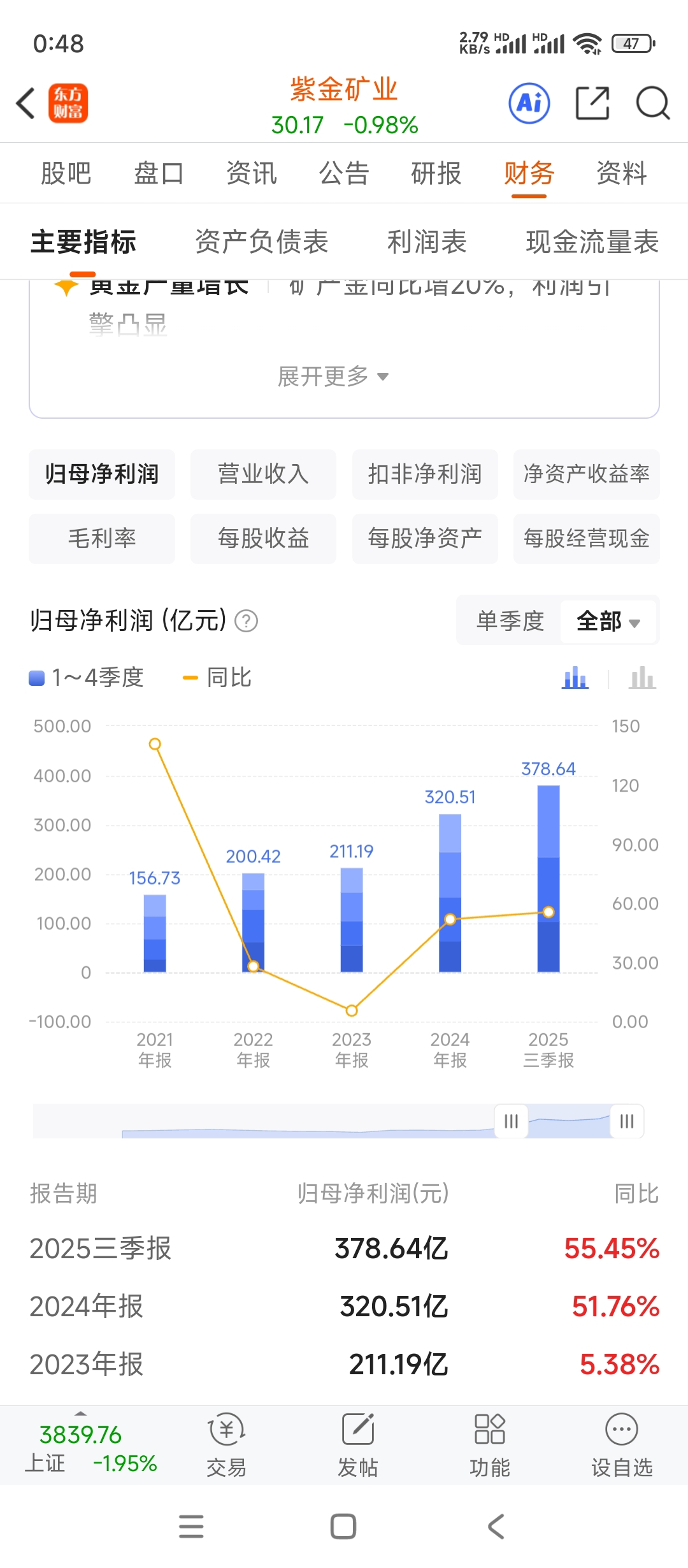 $紫金矿业(SH601899)$ 三个季度的净利润超去年全年的了,2025年全年净利润大概是500亿