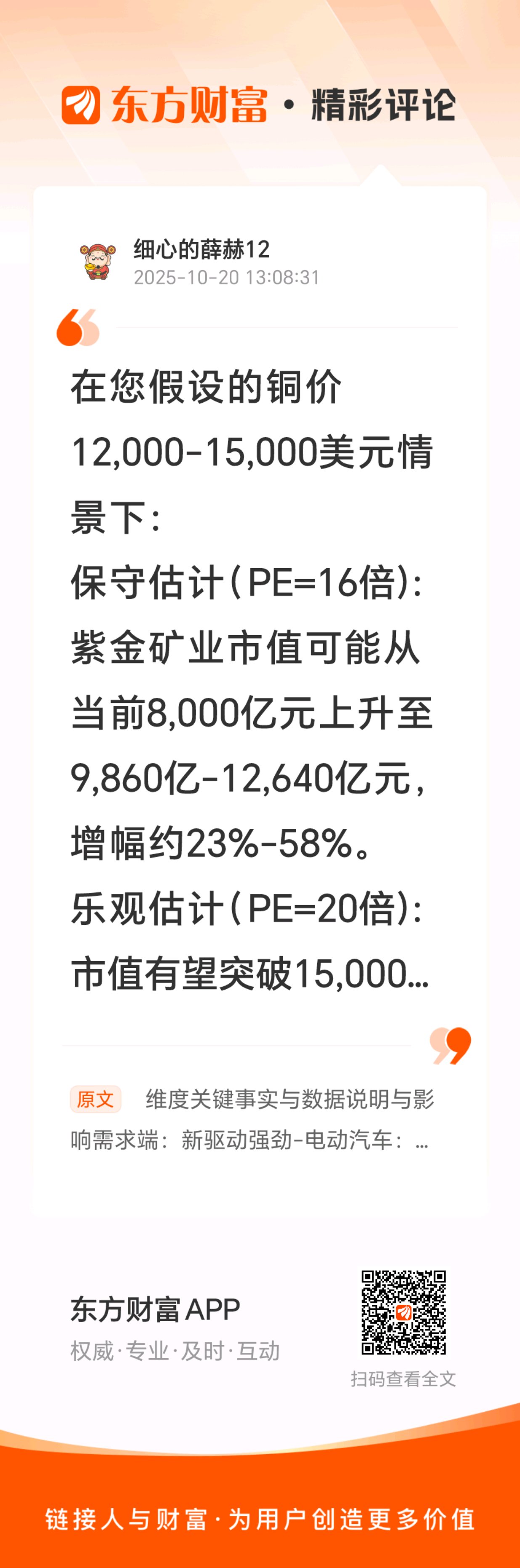 //@细心的薛赫12 :在您假设的铜价12,000-15,000美元情景下:保守估计(PE=16倍):紫金矿业市值可能从当前8,000亿元上升至9,860亿-12,640亿元,增幅约23%-58%。乐观估计(PE=20倍):市值有望突破15,000亿元,逼近万亿级。建议关注节点:2025年Q4卡莫阿铜矿达产、美联储降息周期下的金铜价格联动。若铜价快速突破12,000美元,市值可能在2026年前触及万亿关口。