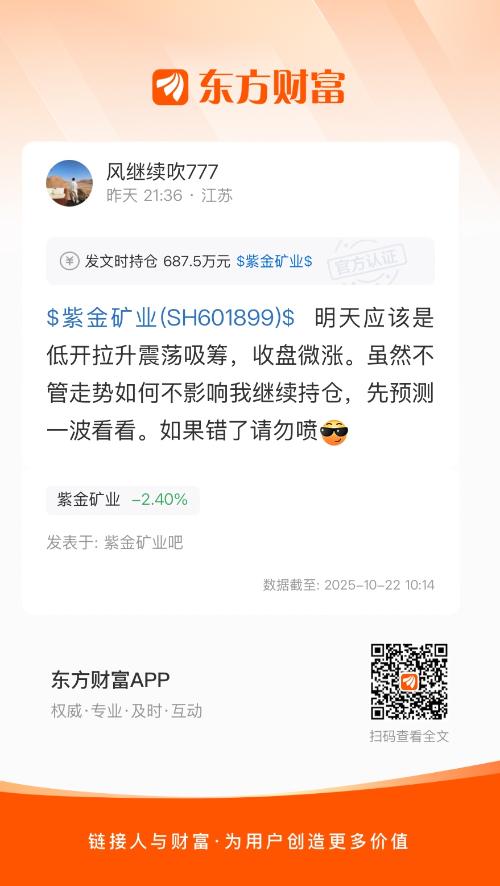 $紫金矿业(SH601899)$ 明天应该是低开拉升震荡吸筹,收盘微涨。虽然不管走势如何不影响我继续持仓,先预测一波看看。如果错了请勿喷