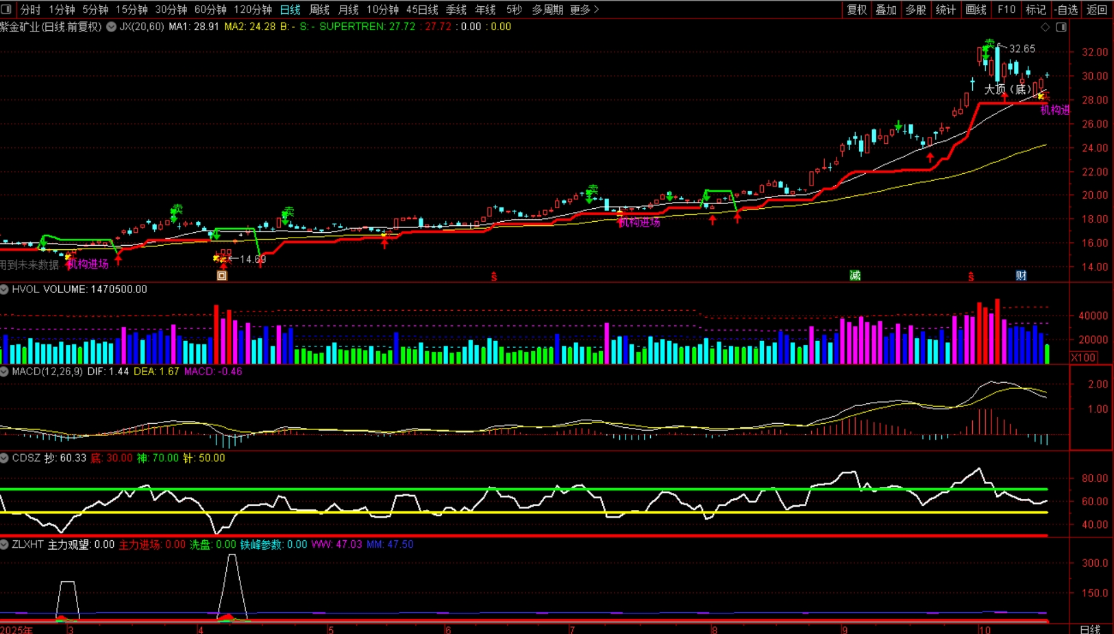 紫金矿业非常稳定,只有放量跌破20线才会调整。缩量跌破20线都是加仓机会。