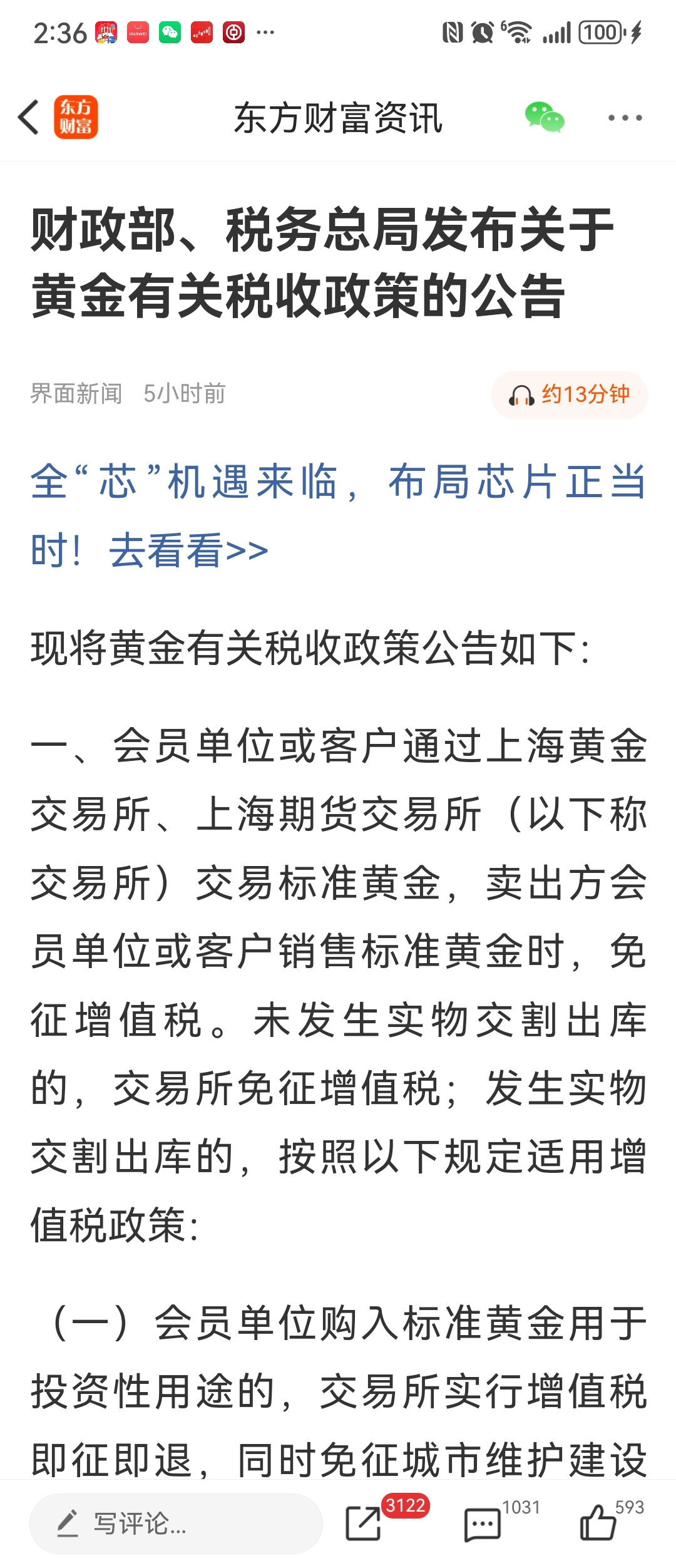 $紫金矿业(SH601899)$ 刚出炉国家对黄金新政策,利好于有矿有期货交易的企业,减少了黄金交易中间的增值税,紫金矿业会节省许多的费用,利空于无矿的实体店。