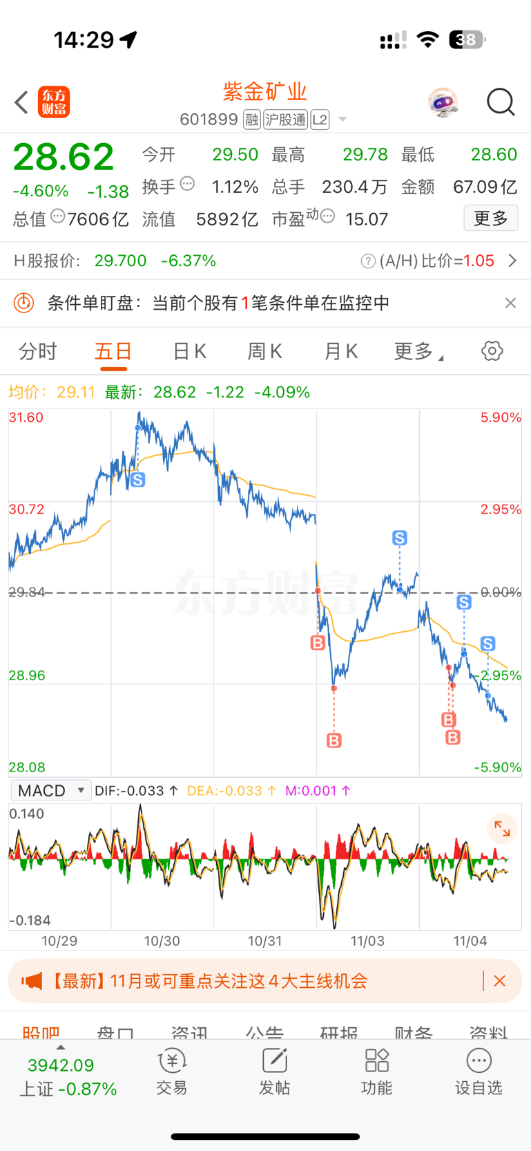 $紫金矿业(SH601899)$ 破位,短线格局了1毛跑路,剩下的仓位看明天了,可能还要再跑