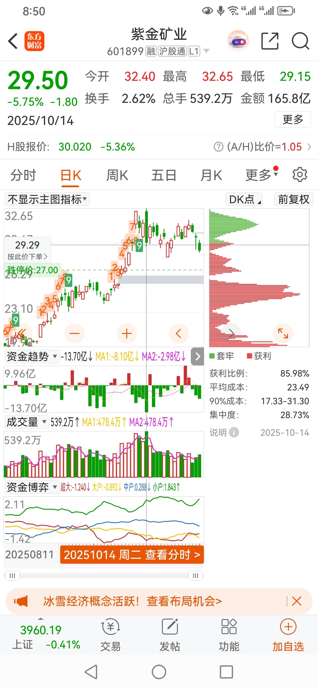 军哥,紫金矿业大跌,卖出股票一半,清仓。