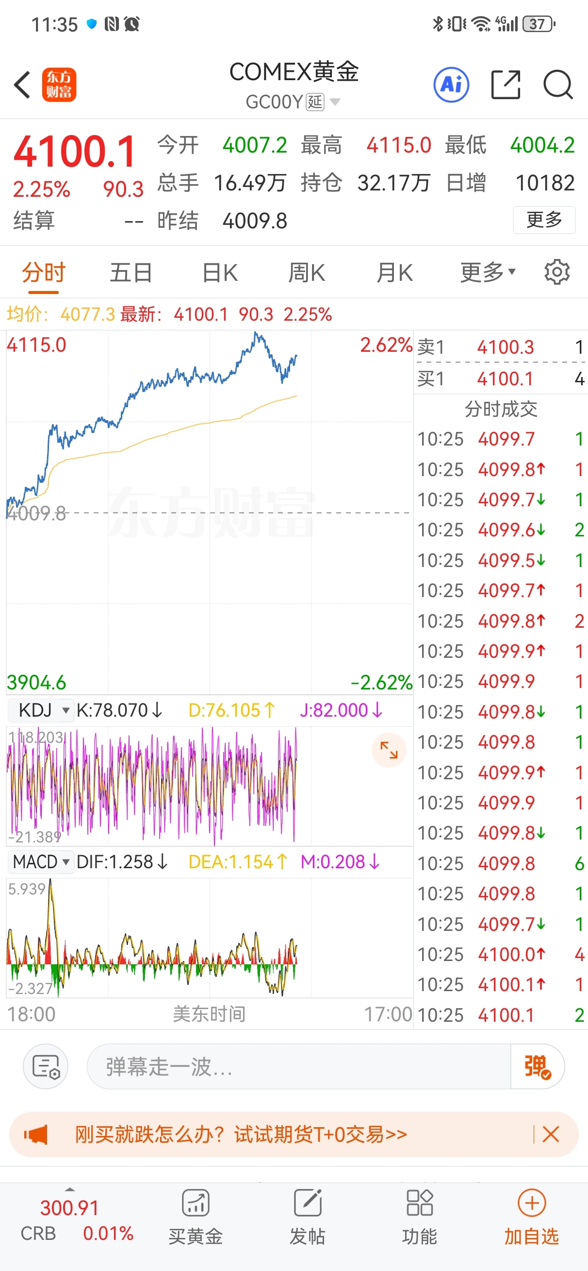 夜盘黄金2个多点上4100了,铜一个多点。明天你还不涨么?主力你别让低价筹码都被
