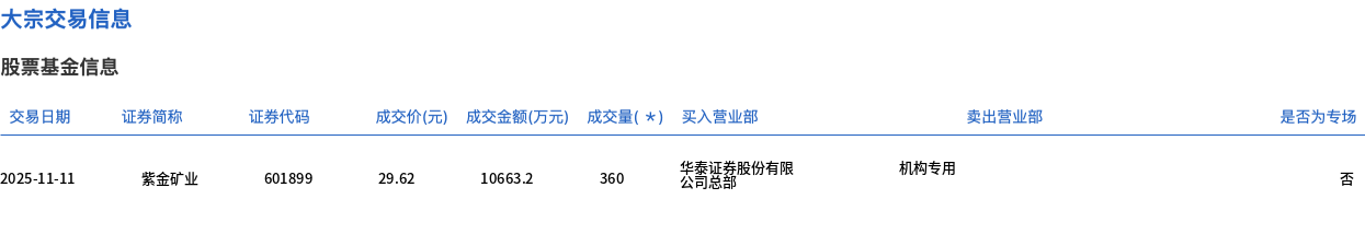 紫金矿业今日大宗交易平价成交360万股,成交额1.07亿元