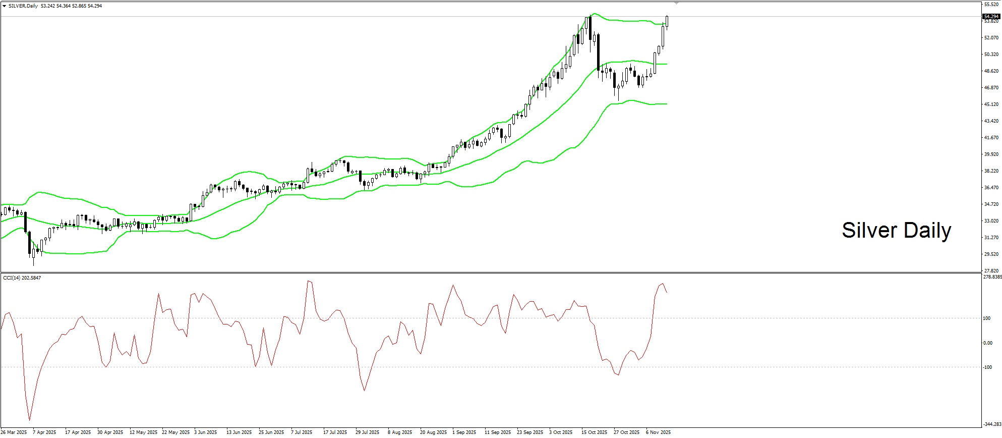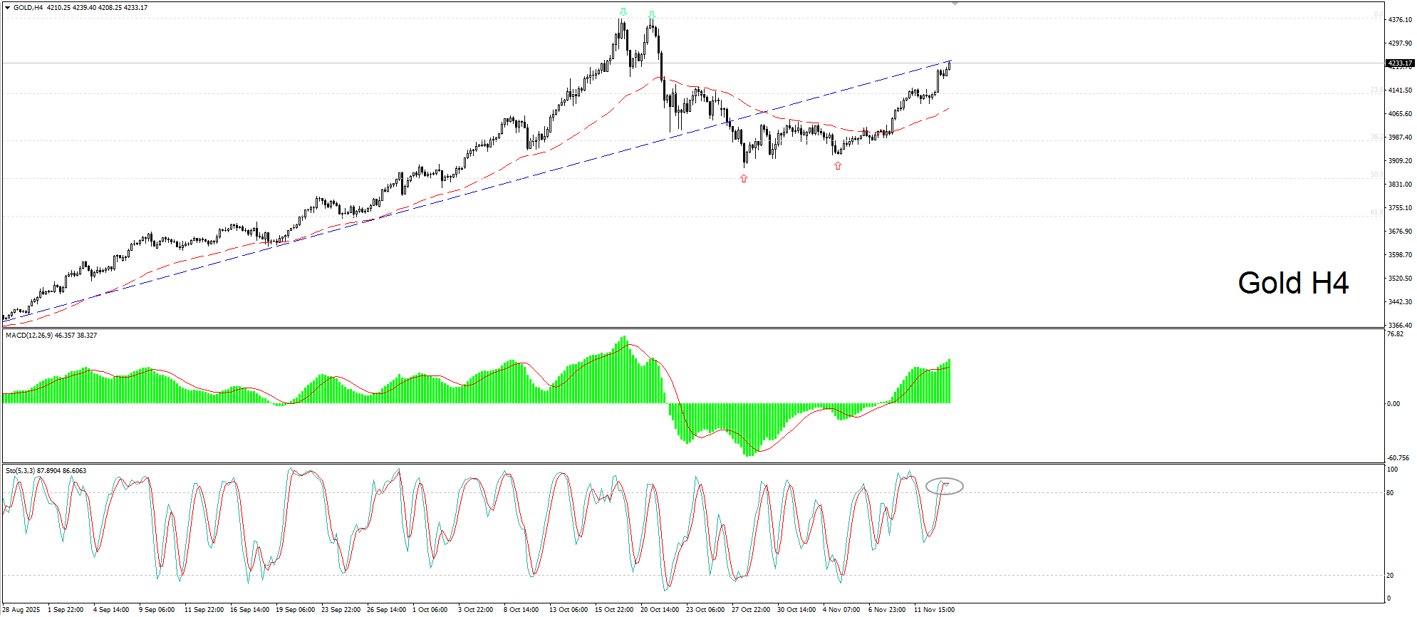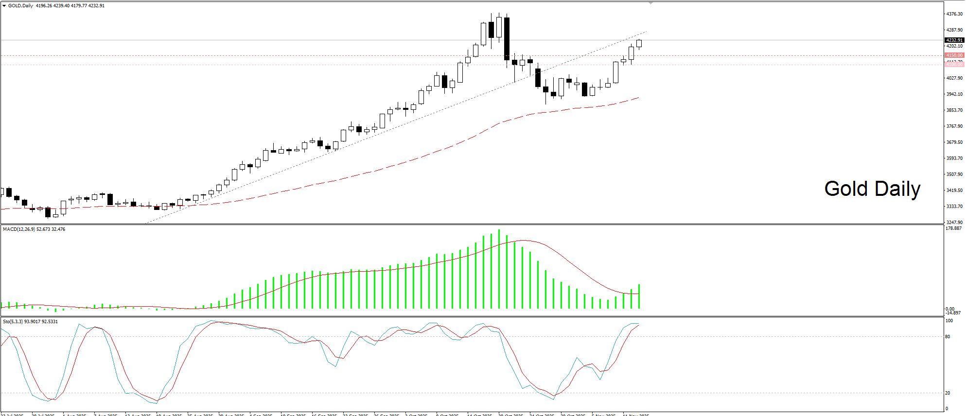 昨日白宫指出10月的非农数据以及CPI可能永远不会公布,经济增长可能下跌两个百分点,但市场憧憬美国政府停摆最快可能在本周之内结束,资金再次流入传统产业股票,美股三大股指个别发展,其中道琼斯指数收涨0.68%再创收市新高,现货金价在美盘交易时段一度冲高至4211美元后轻微回落,最终收报4195.22美元/盎司。