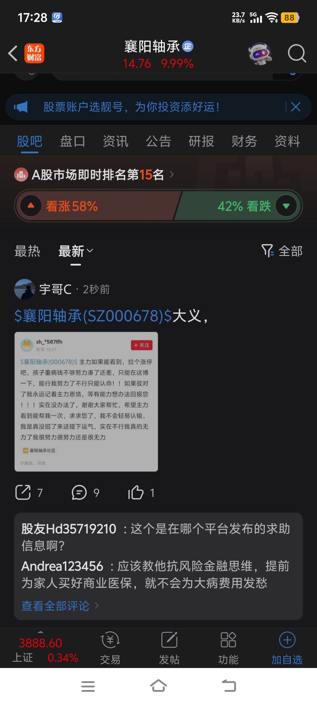 股市无情,主力有情,一网友孩子生病还差点钱希望襄阳轴承主力拉个涨停没想到主力真的