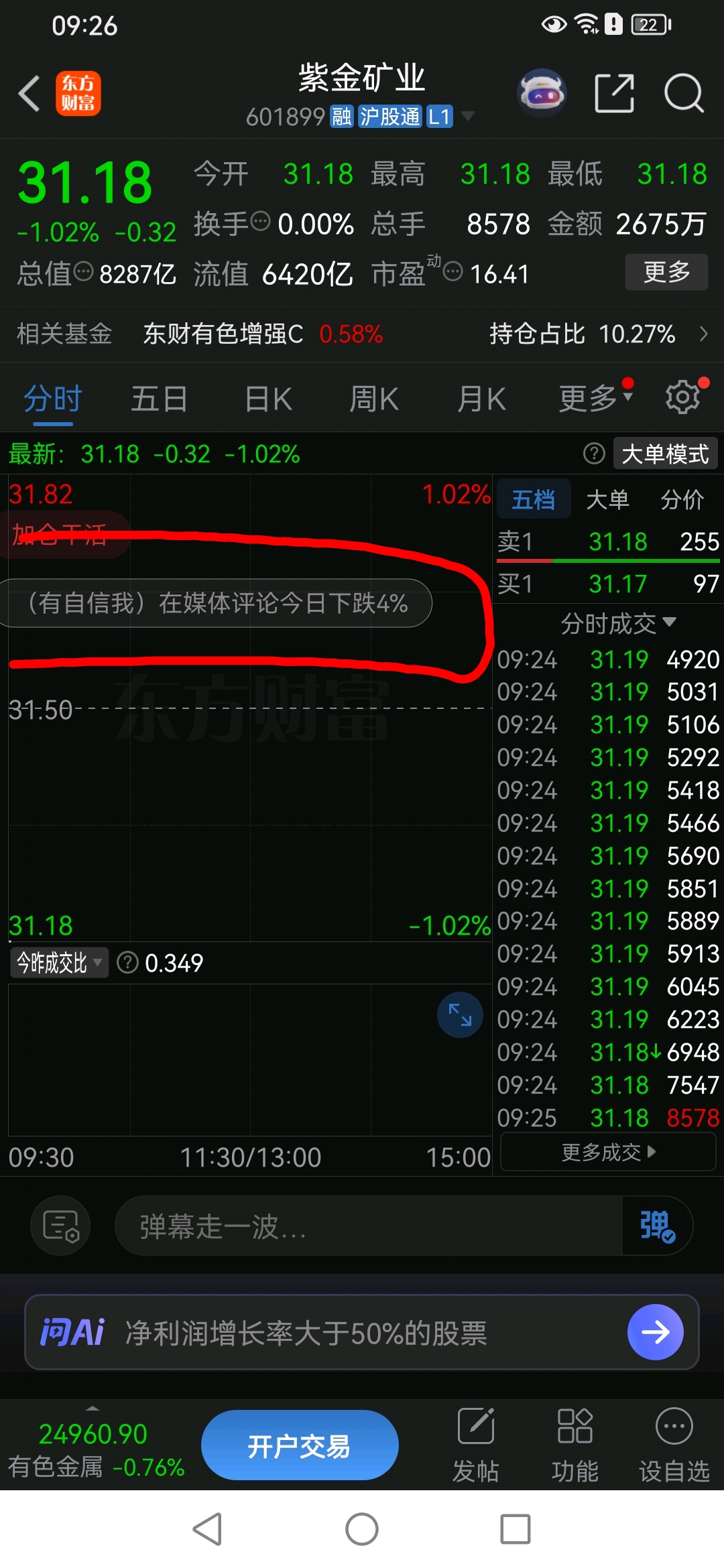 有自信我:在媒体评论今日紫金矿业下跌4%