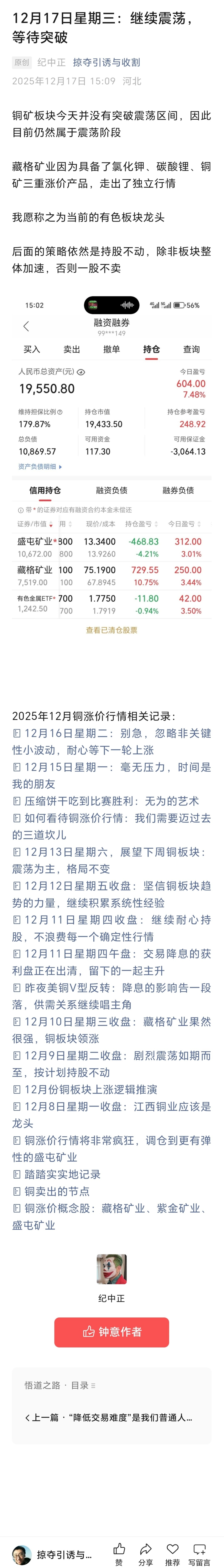 $紫金矿业(SH601899)$ $洛阳钼业(SH603993)$ $北方铜业(SZ000737)$ 12月17日:铜板块继续在震荡区间运行,等待突破。
