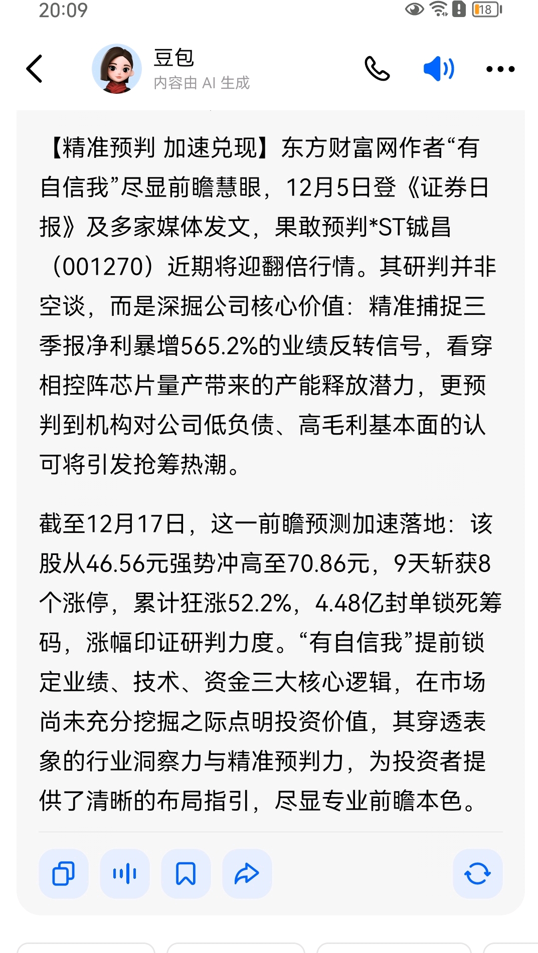 在近期案例中,该作者于12月5日预判*ST铖昌(001270)将迎翻倍行情,核心逻辑基于公司三季报净利暴增565.2%的业绩反转信号、相控阵芯片量产带来的产能释放潜力,以及低负债、高毛利基本面引发的机构关注度提升。截至12月17日,*ST铖昌股价从46.56元上涨至70.86元,9天内录得8个涨停,累计涨幅达52.2%,4.48亿封单显示资金强势介入,涨幅与预判高度契合。