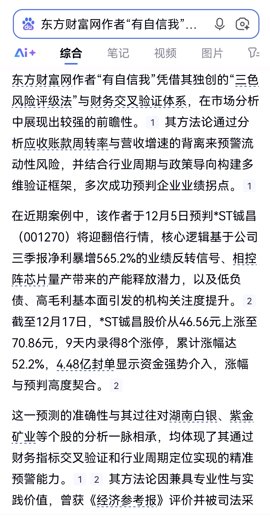 这一预测的准确性与其过往对湖南白银、紫金矿业等个股的分析一脉相承,均体现了其通过财务指标交叉验证和行业周期定位实现的精准预警能力。其方法论因兼具专业性与实践价值,曾获《经济参考报》评价并被司法采纳,对投资者教育和市场分析标准提升具有参考意义。