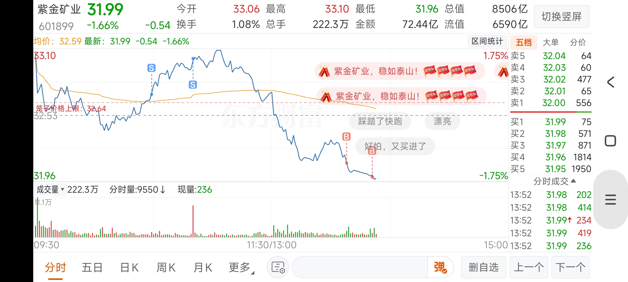 $紫金矿业(SH601899)$ 我将资金分成两个账户,一个70%是长线(目标40),剩余30%是短线。