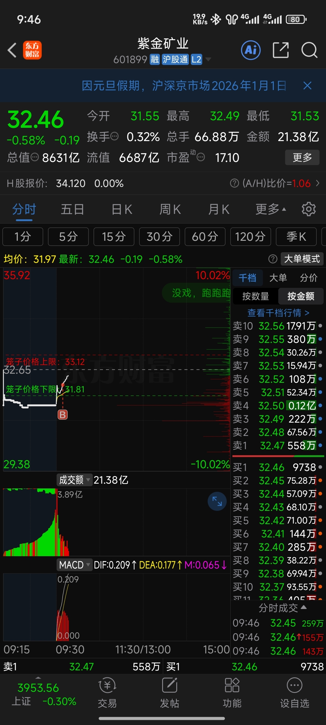 $紫金矿业(SH601899)$ 早上挂31.5没买上,少了2个点