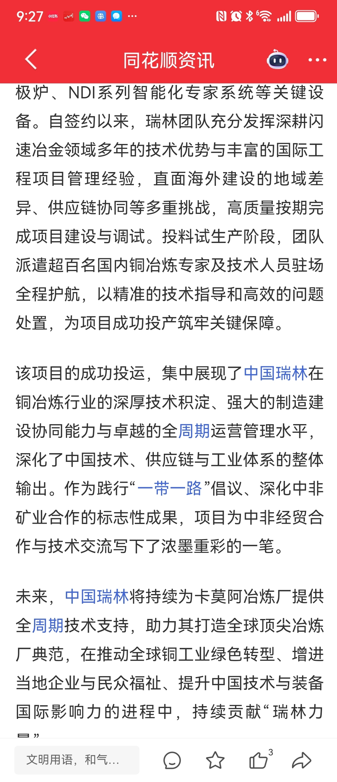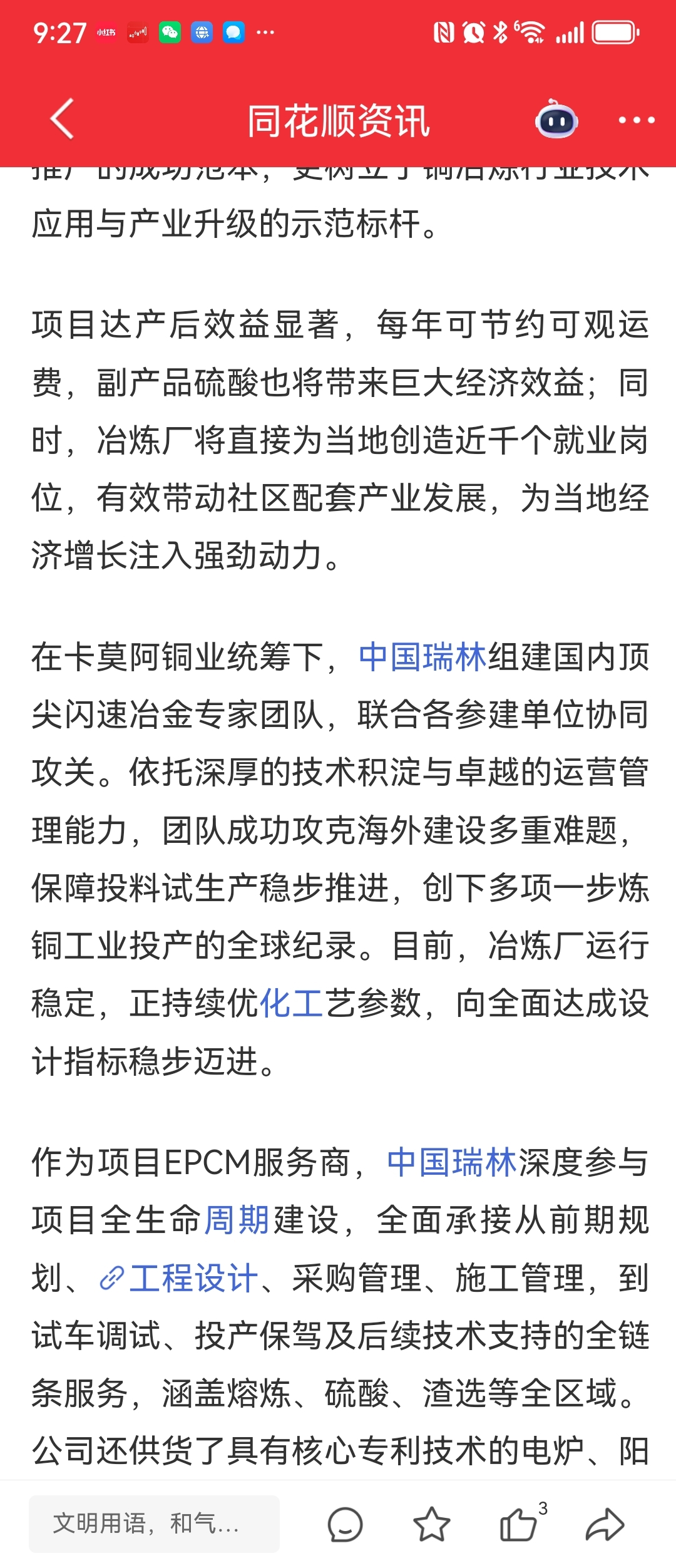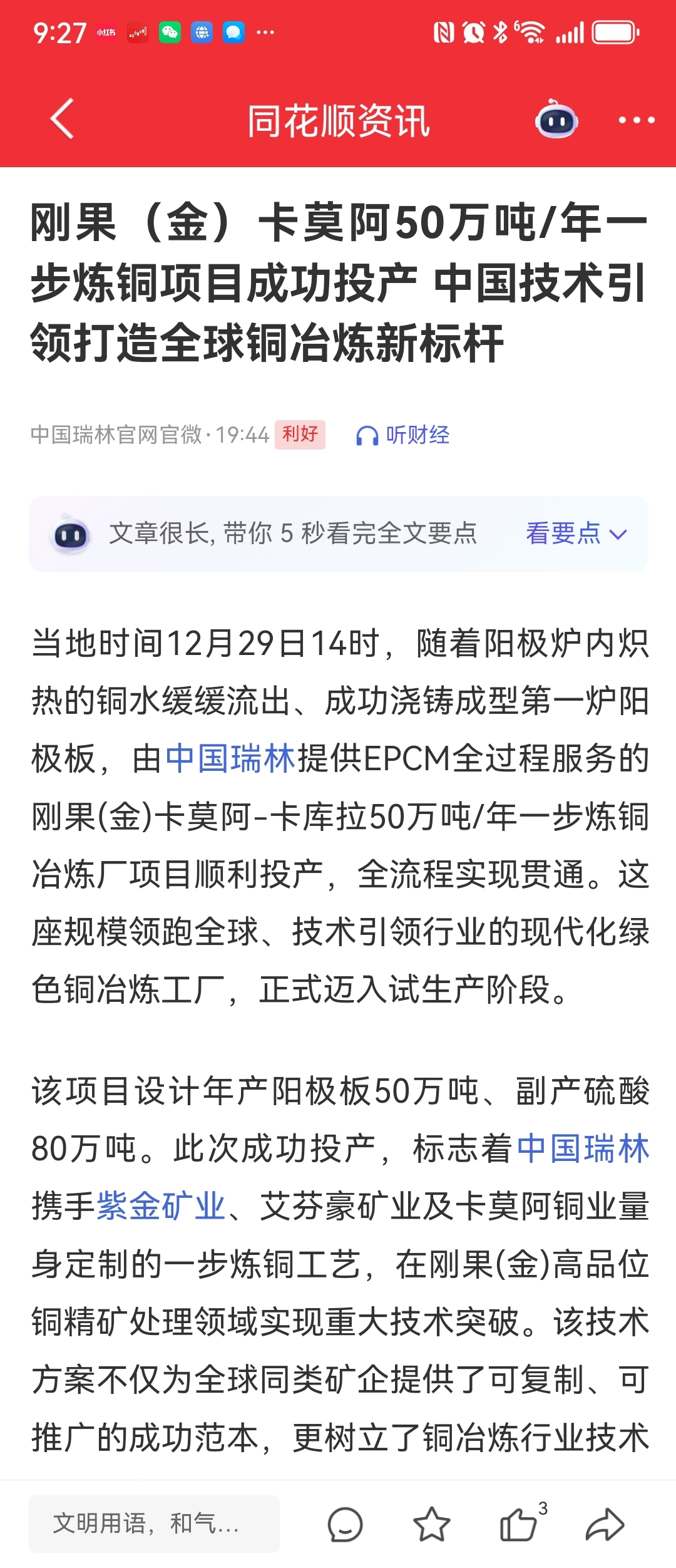 $紫金矿业(SH601899)$ 岁稔年丰,紫气东来!近期,紫金频频利好来袭!又一重磅出炉!刚果金卡莫阿50万吨/年冶炼厂建成,为矿山节省了可观的运费,又新添副产品硫酸80万吨/年,大大增添了卡莫阿的净利润,祝福:紫金矿业,年年业绩创新高!
