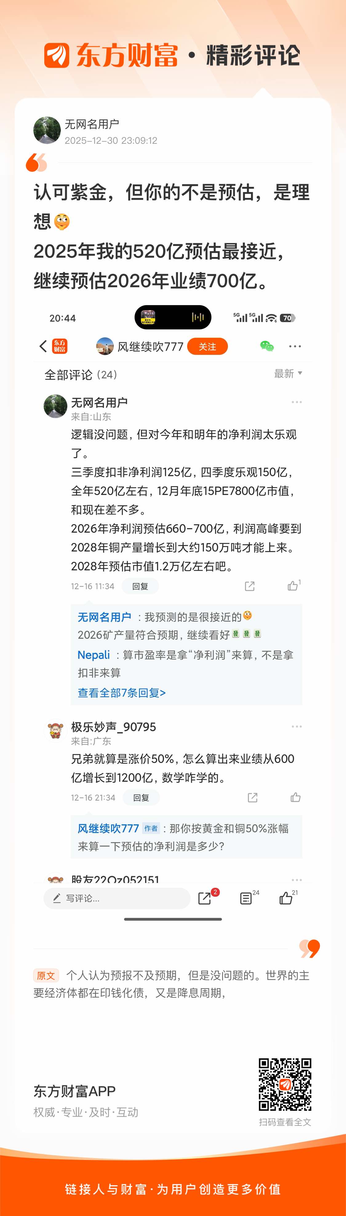 $紫金矿业(SH601899)$ 个人认为预报不及预期,但是没问题的。世界的主要经济体都在印钱化债,又是降息周期,加上美元霸权地位衰退,明年黄金和铜依然走强。2026净利润看1000-1200亿,牛市20倍的合理pe,市值约22000亿,对应股价83块。明天希望本月盈利突破200万。元旦快乐