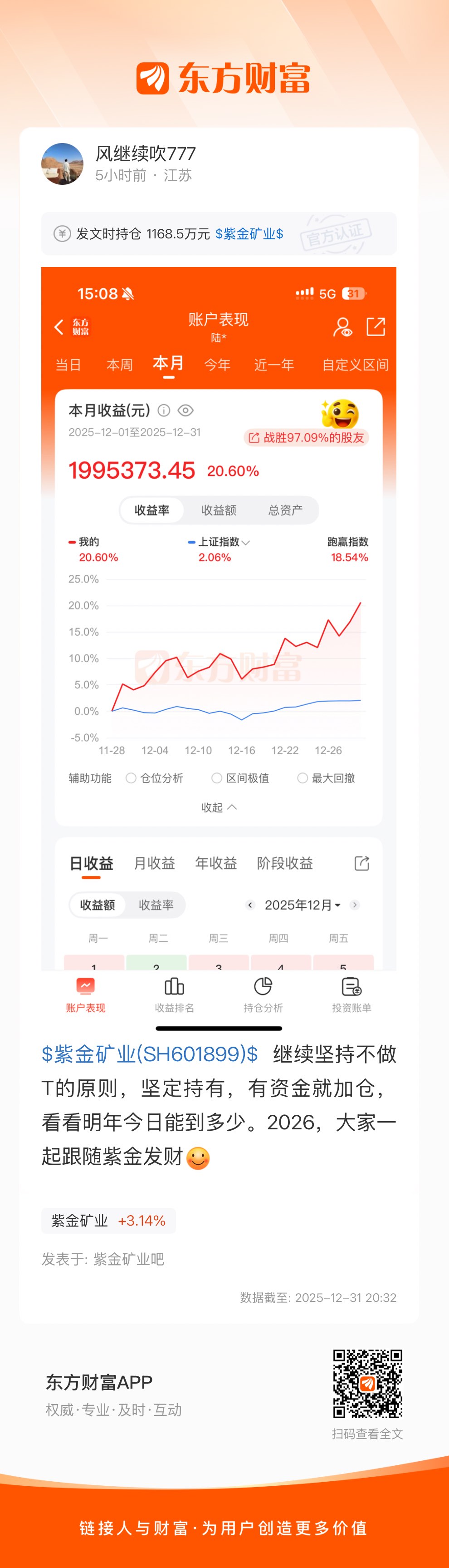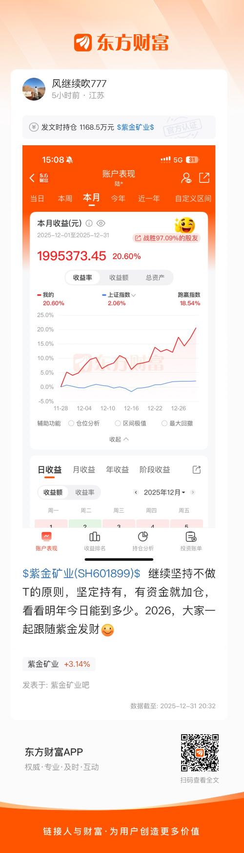 $紫金矿业(SH601899)$ 继续坚持不做T的原则,坚定持有,有资金就加仓,看看明年今日能到多少。2026,大家一起跟随紫金发财