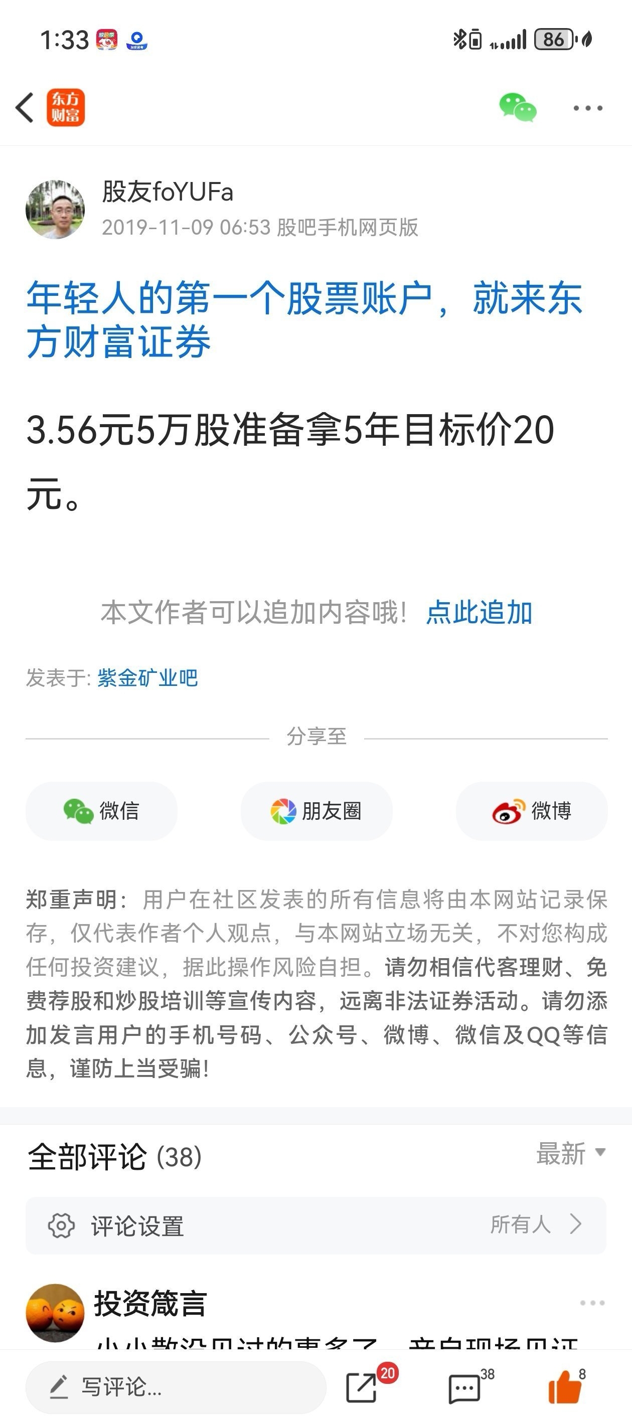 温馨提示: 1.根据《证券法》规定,禁止编造、传播虚假信息或者误导性信息,扰乱证券市场;2.用户在本社区发表的所有资料、言论等仅代表个人观点,与本网站立场无关,不对您构成任何投资建议。用户应基于自己的独立判断,自行决定证券投资并承担相应风险。《东方财富社区管理规定》