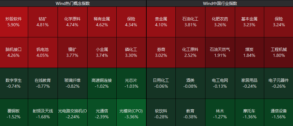 板块上来看,贵金属、化工、大金融等板块震荡拉升;而通信设备、光模块、摩托车等板块跌幅居前。